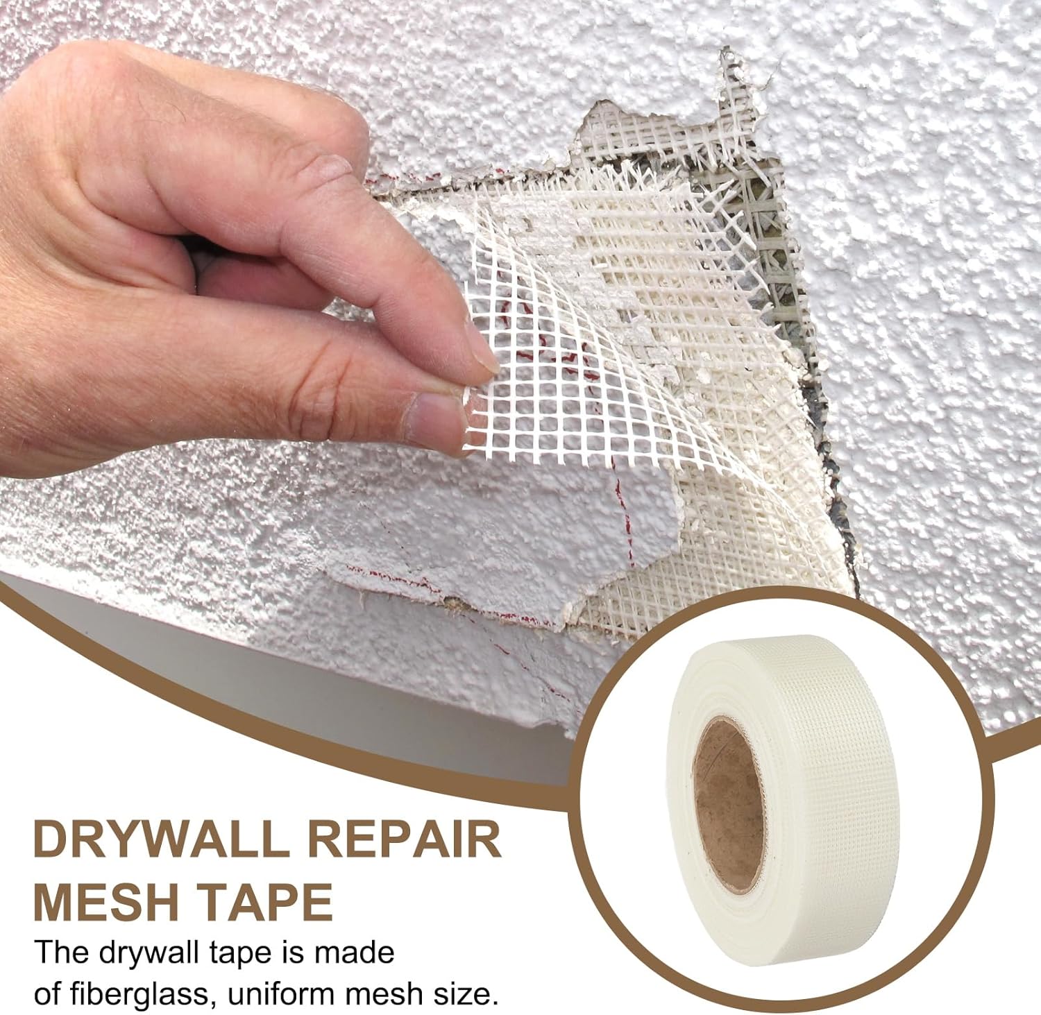 • Color: White; Hole Diameter: 12 Mesh; Total Size: 50 m x 5 cm / 164.04 Ft x 1.97 inch (LxW); Packing List: 1 Pcs x Drywall Repair Mesh Tape