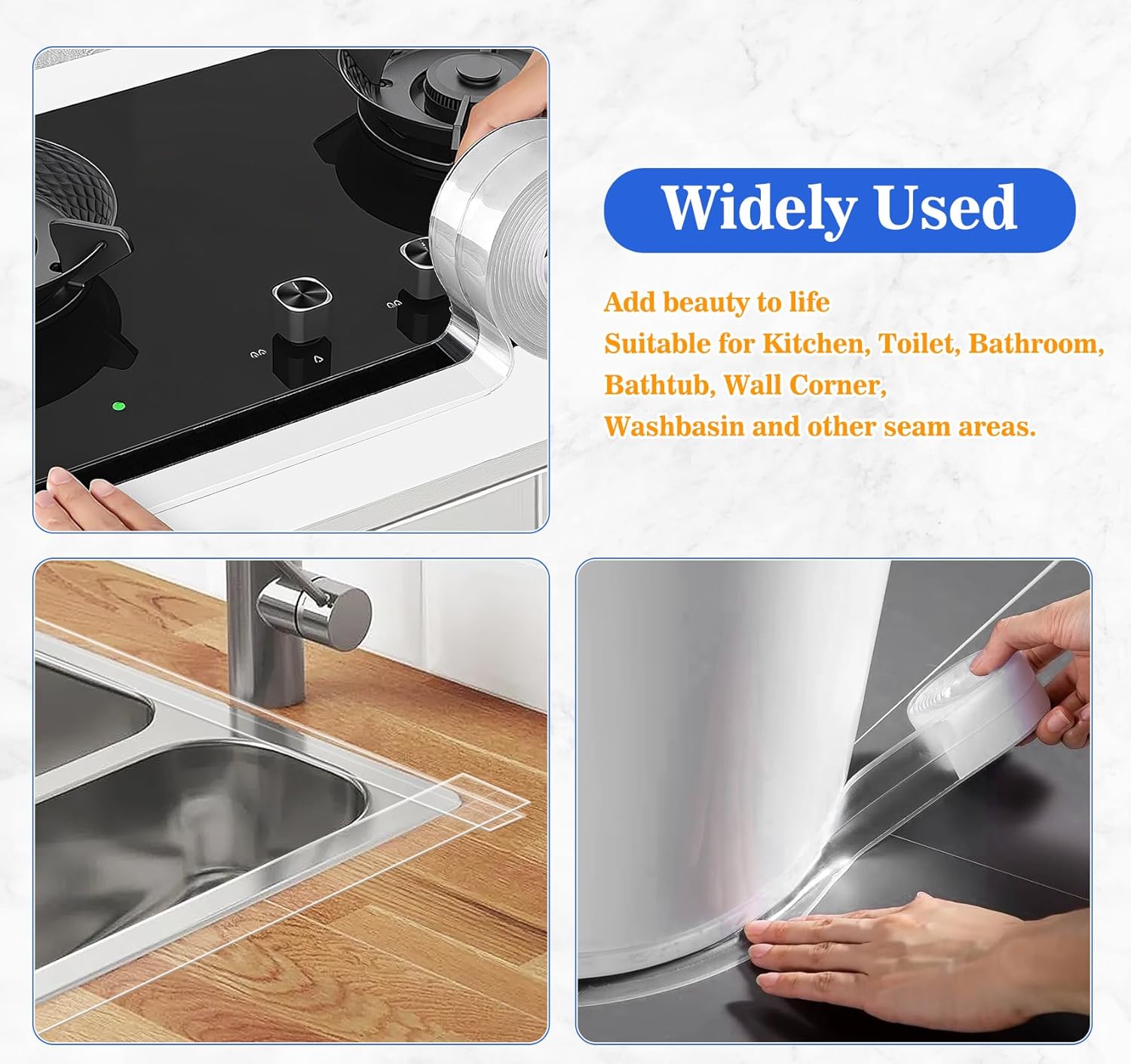 • ✅Wide Applications: Self-adhesive clear caulk strip sealant tape is widely used for sealing joints in kitchen, toilets, bathroom, sinks, pools, bathtubs, gas stoves and walls. The shower tape caulk strip can prevent them from blackening and keep your kitchen and bathroom clean and tidy.