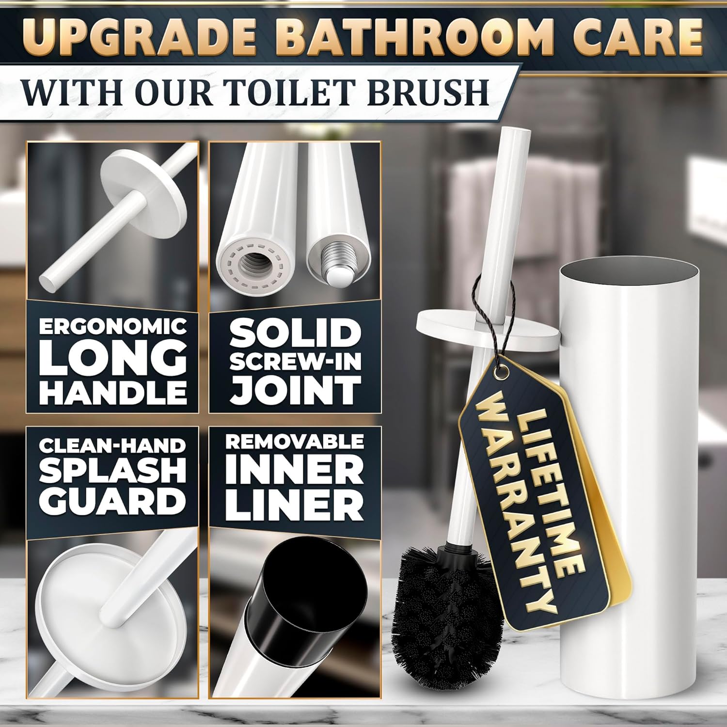 Stainless Steel Toilet Brush and Holder Set White - Long Handle Toilet Bowl Cleaner Brush and Holder - Removable Inner Liner, Shiny Design, Splash Protection & Dense Bristles for Bathroom Cleaning