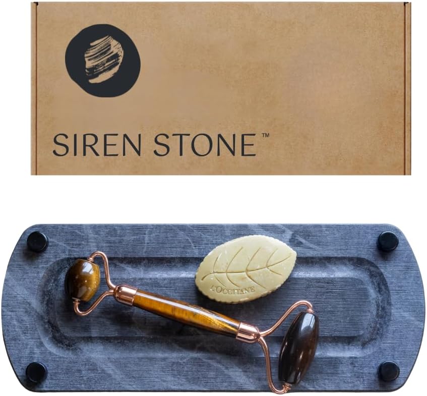 - ELEVATED PREMIUM SINK ORGANIZER: The Siren Stone sink caddy features an innovative raised design with stainless steel legs and non-slip rubber feet, creating optimal 360° airflow that ensures rapid drying. This sophisticated slate tray measures 10" x 4" x 1.25" and transforms your sink area into a thoughtfully curated space while preventing water damage to countertops.