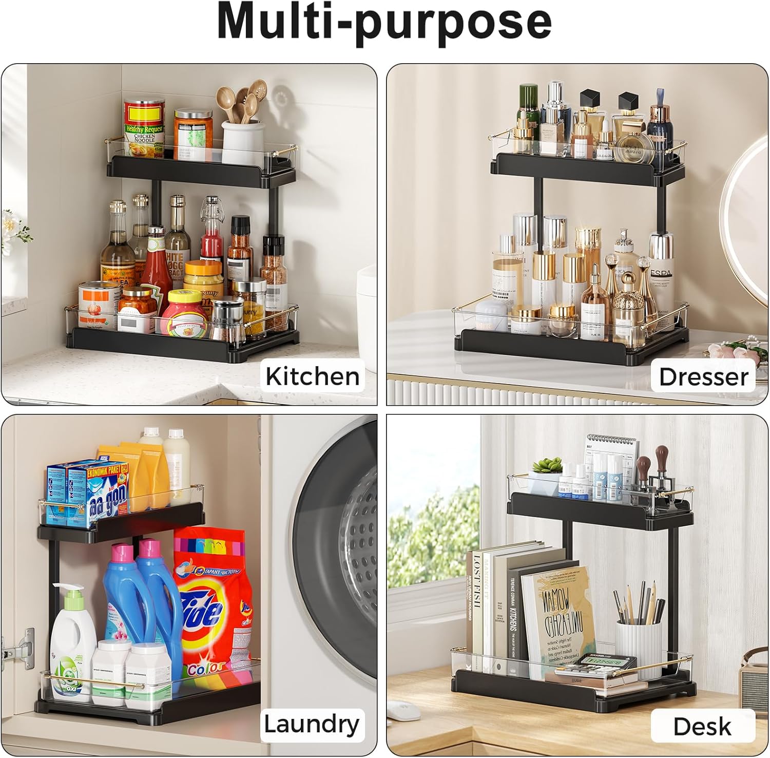 heart & home 2-Pack Under Sink Storage Organizer for Kitchen & Bathroom Cabinets with Removable Washable Tray, Tool-Free Assembly – Multi-Purpose for Vanity, Laundry & Countertop, Black