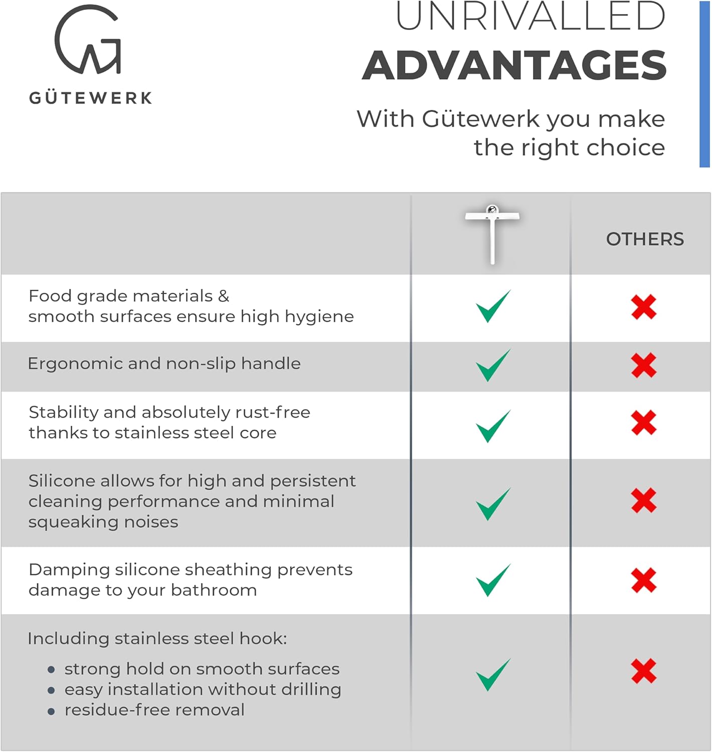 • MINIMALIST TIMELESS DESIGN - The GÜTEWERK glass squeegee is crafted with a matte black finish that impresses with its elegant timeless and smart design. In addition, the chrome-colored stainless-steel hook integrates well with any modern bathroom.