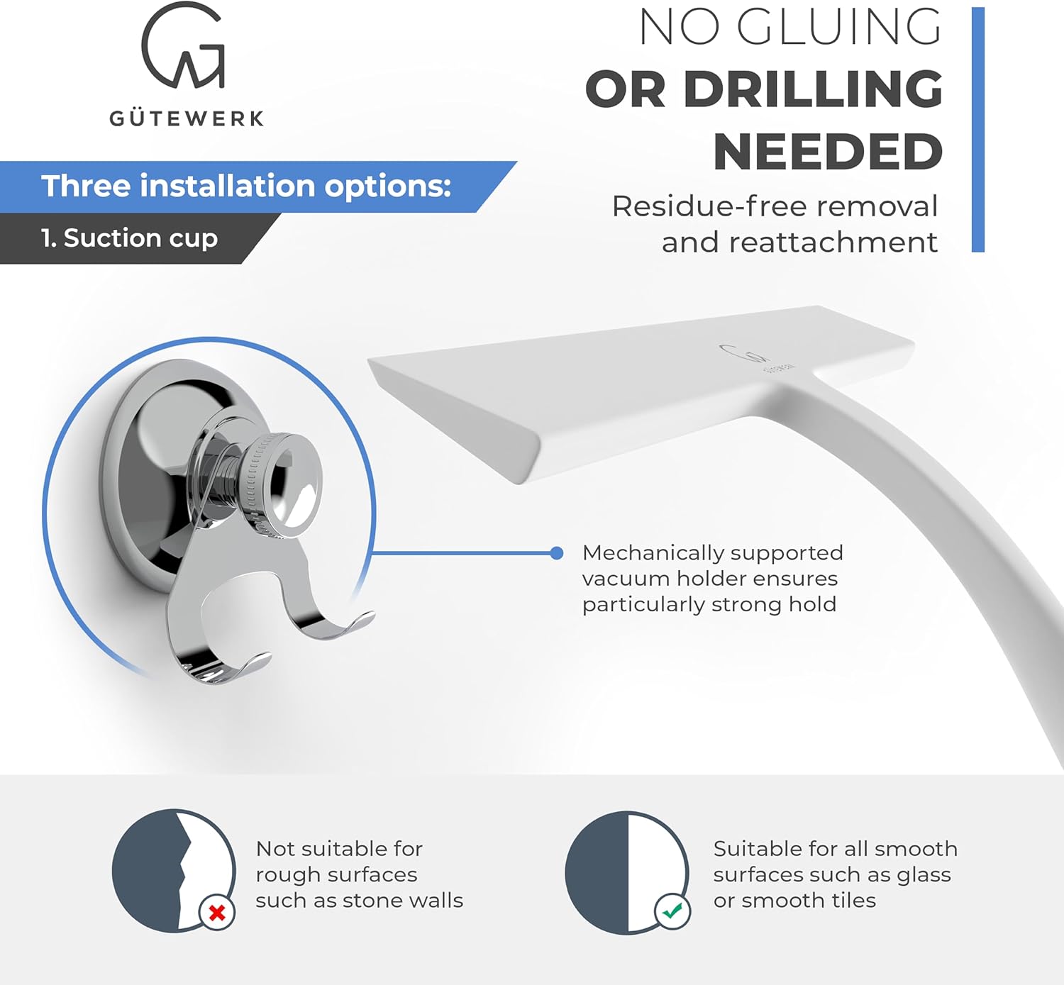 • SUPER STRONG SUCTION HOOK - No drilling or gluing required! You can easily remove and reattach the squeegee stainless steel hook to smooth surfaces such as panes, tiles, shower walls, shower glass surfaces, doors, cubicles, and enclosures.