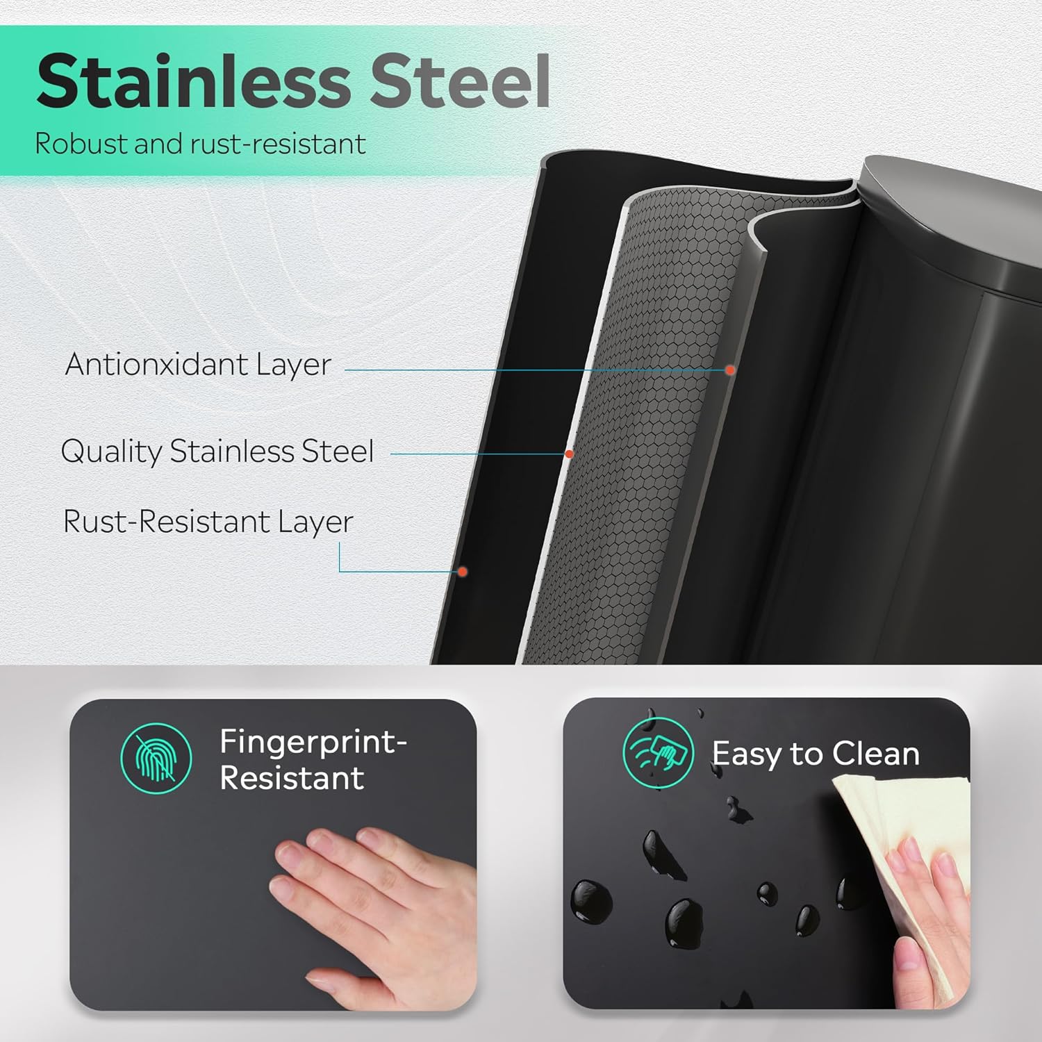 • High-quality Materials: The garbage can is constructed from durable stainless steel, featuring a long-lasting surface that resists fingerprints, stains, and is easy to clean—simply wipe away dirt with a damp cloth to keep it looking fresh.