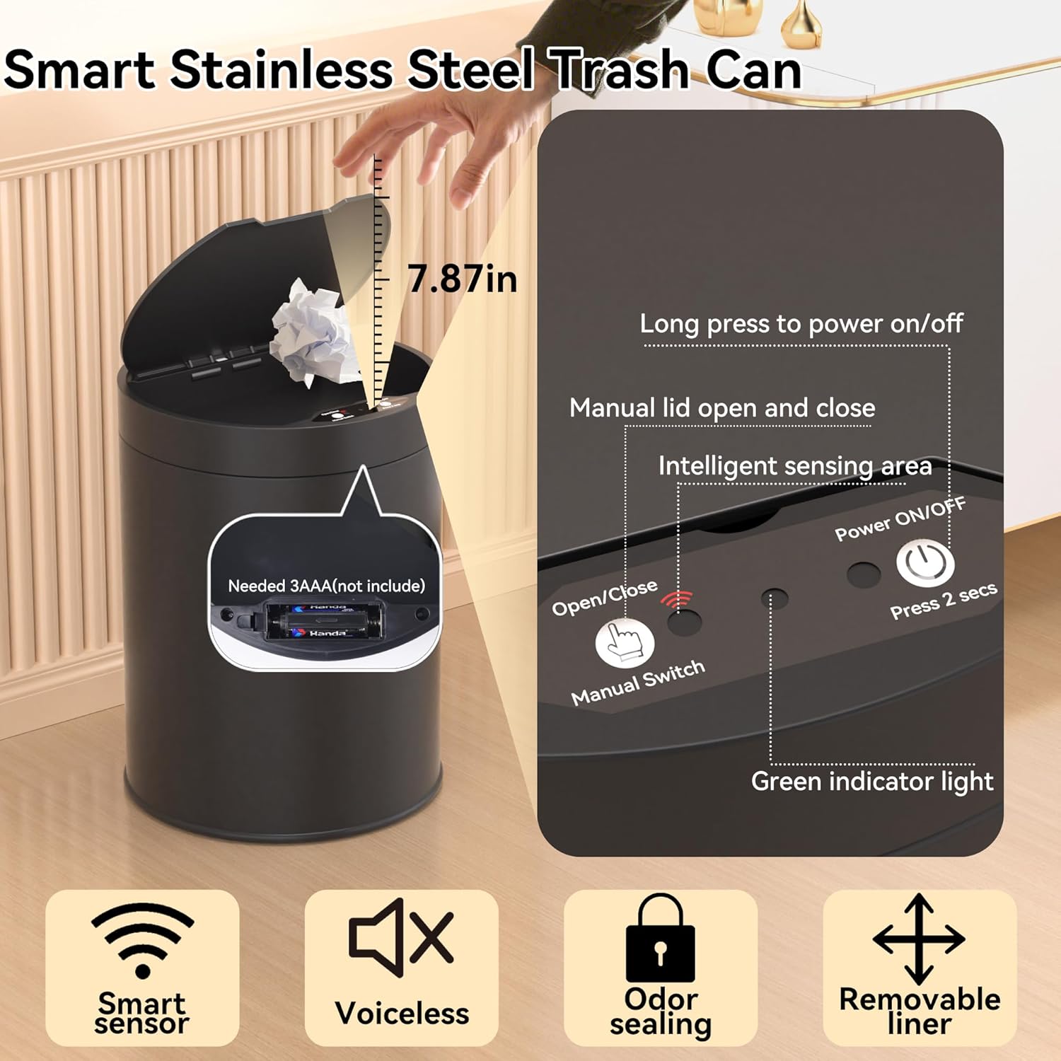 • WARM TIPS: Install 3 AAA batteries (not included) before using the round stainless steel garbage cans. For any product issues during use, please feel free to reach out to us, we will resolve them promptly