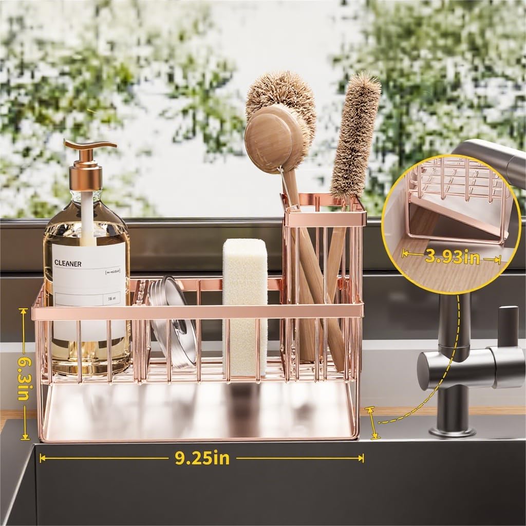 Cisily Sink Caddy Organzier with High Brush Holder, Sponge Holder for Sink, 304 Rustproof Stainless, Kitchen Countertop Soap Dispenser Organizer, Rose Gold Kitchen Decor and Accessories