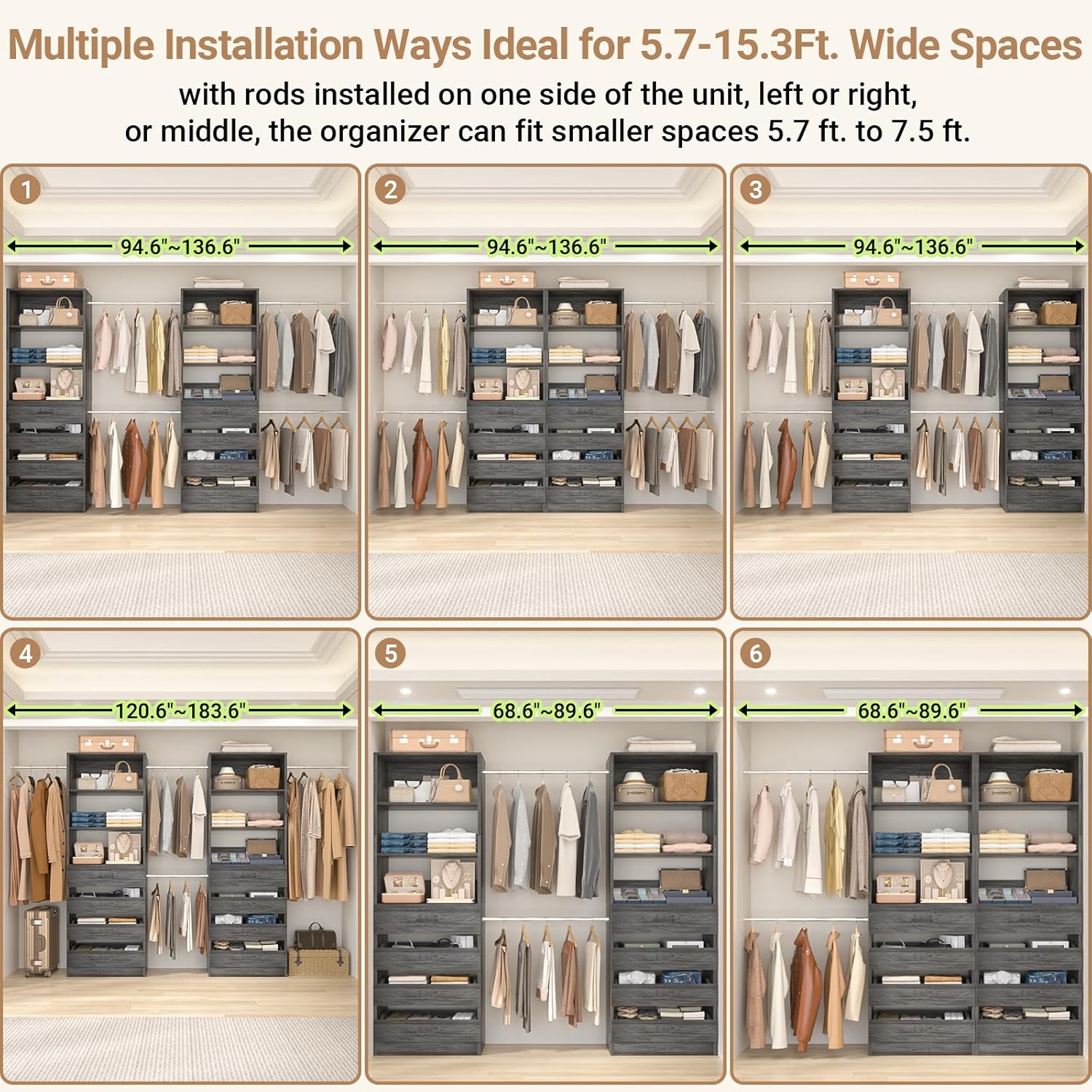 - Aheaplus Closet System, 6-15Ft Closet Organizer with 8 Wooden Drawers, Wood Closet Organizer System with Tower, Walk-in Closet Organizer Wardrobe Garment Clothes Rack with 4 Hanging Rods, Black Oak