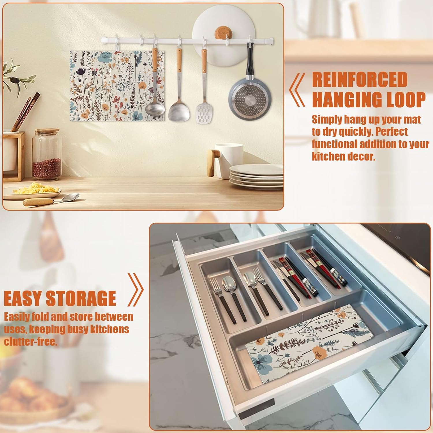 Vintage Floral Dish Drying Mat for Kitchen Counter Microfiber Absorbent Dish Kitchen Drying Mat Draining Reusable Washable for Dishes/Utensils/Counterto