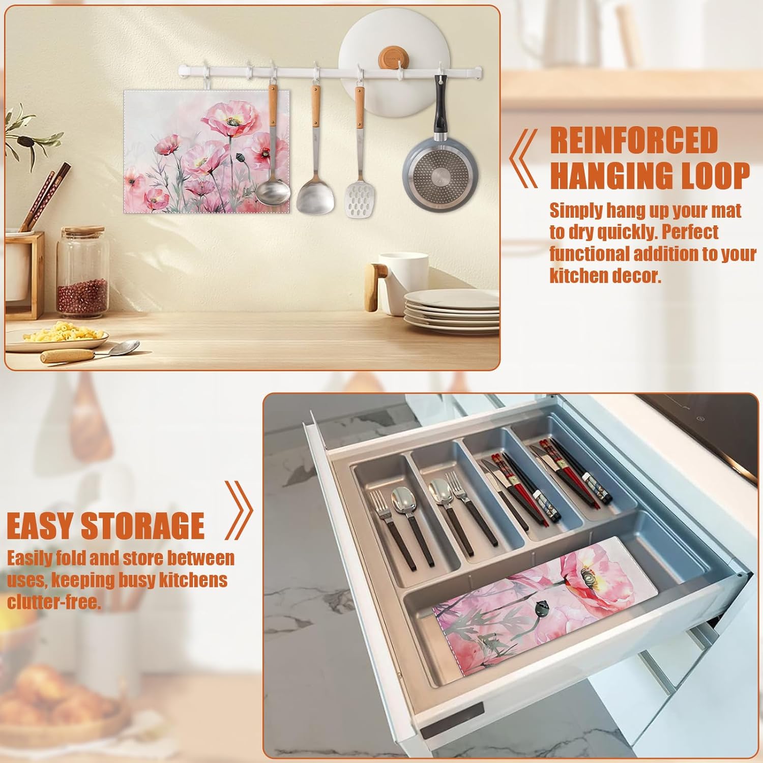• 【Easy to Clean】The utensil drying mat can be cleaned by hand or machine to remove stains, the kitchen utensil drying mat to dry quickly without a machine. HD printed suede has excellent color lock, does not fade and can be reused many times.