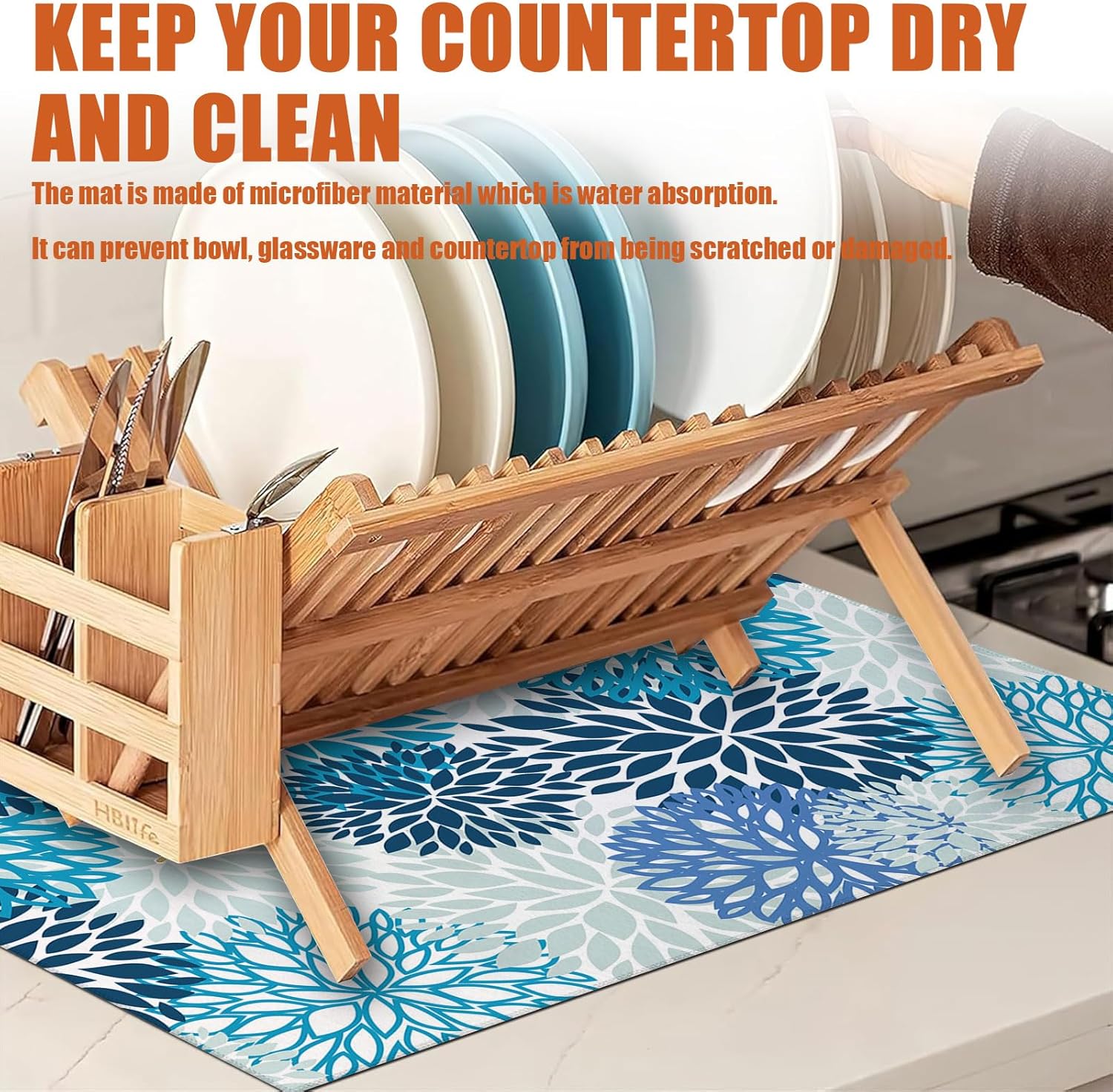 Blue Floral Dish Drying Mat for Kitchen Counter Microfiber Absorbent Dish Kitchen Drying Mat Draining Reusable Washable for Dishes/Utensils/Counterto