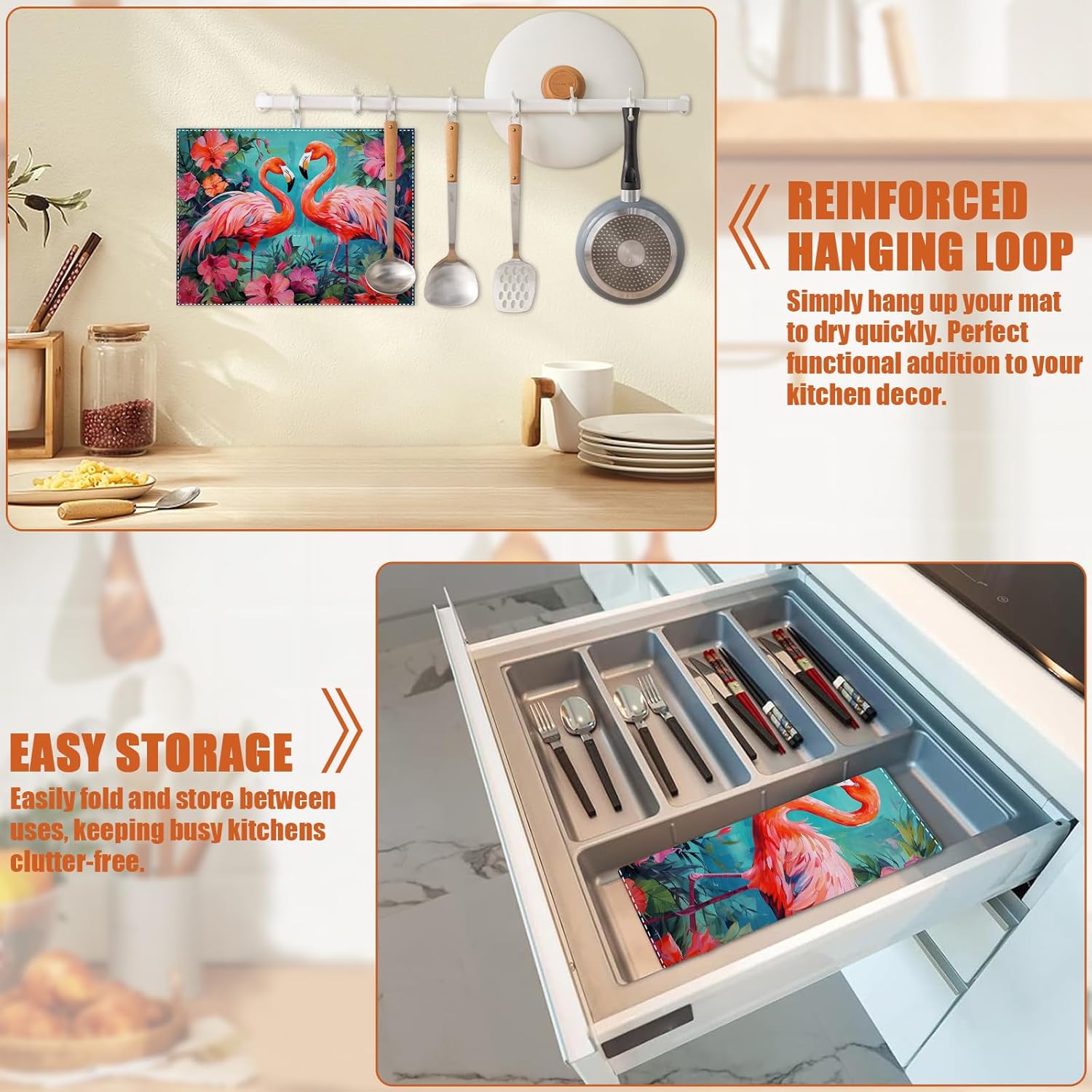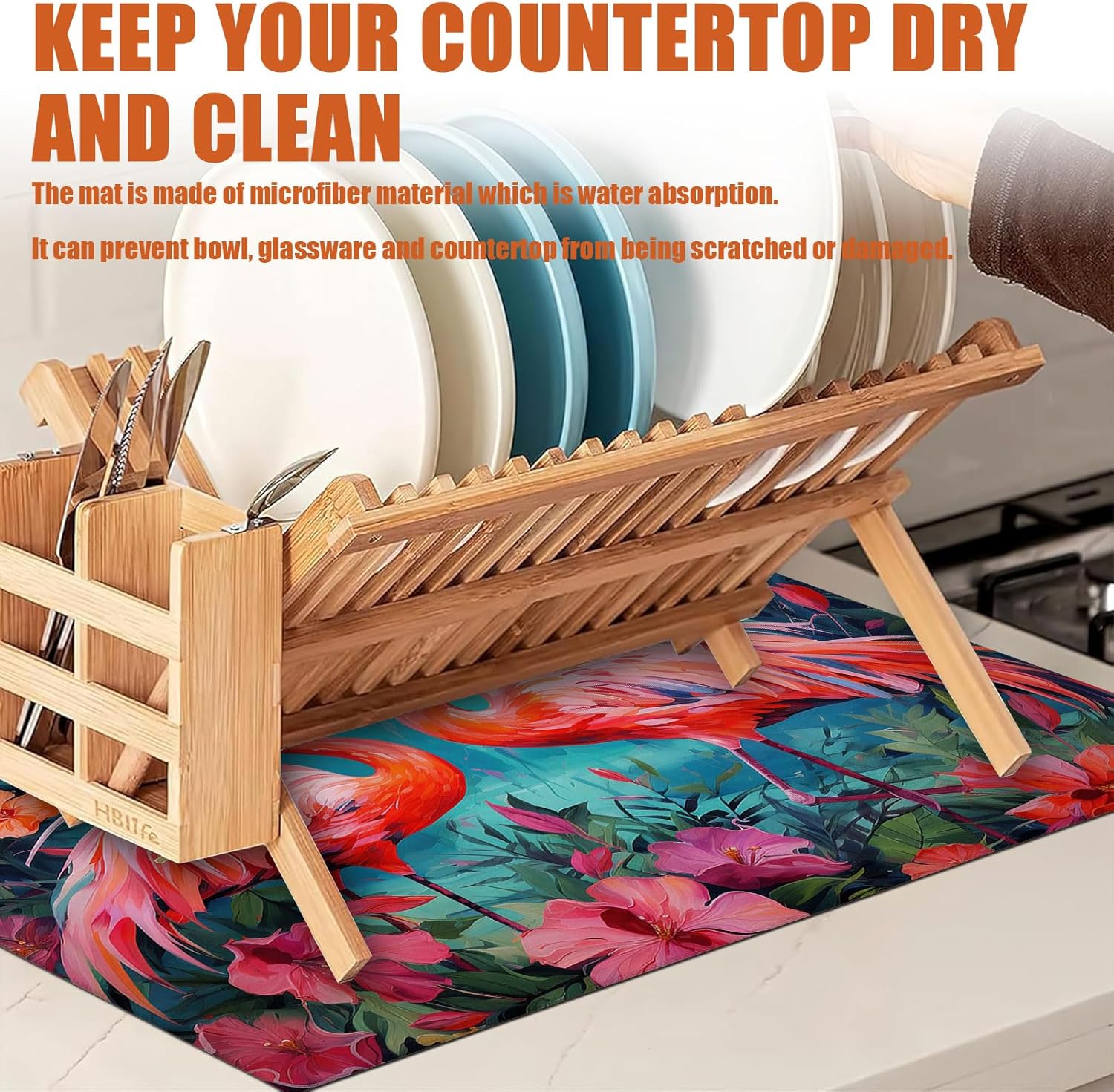 Tropical Flower Flamingo Dish Drying Mat for Kitchen Counter Microfiber Absorbent Dish Kitchen Drying Mat Draining Reusable Washable for Dishes/Utensils/Counterto