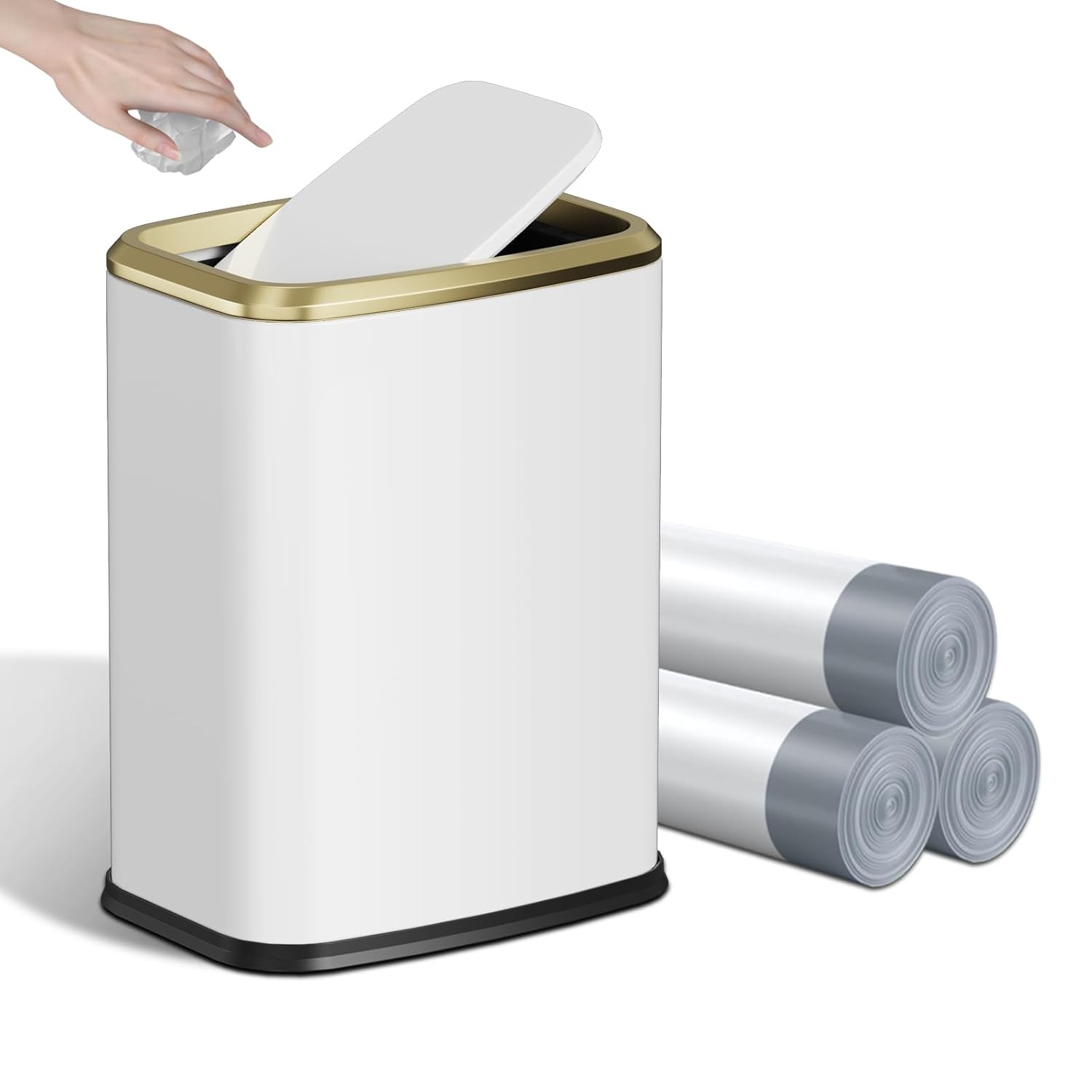 • Hidden Trash Bag System: The inner bucket’s secure slot holds liners in place, preventing slippage. The swing lid fully conceals your trash and trash bag, keeping unsightly trash out of sight. Comes with 3 rolls of drawstring trash bags. Get ready to use instantly.