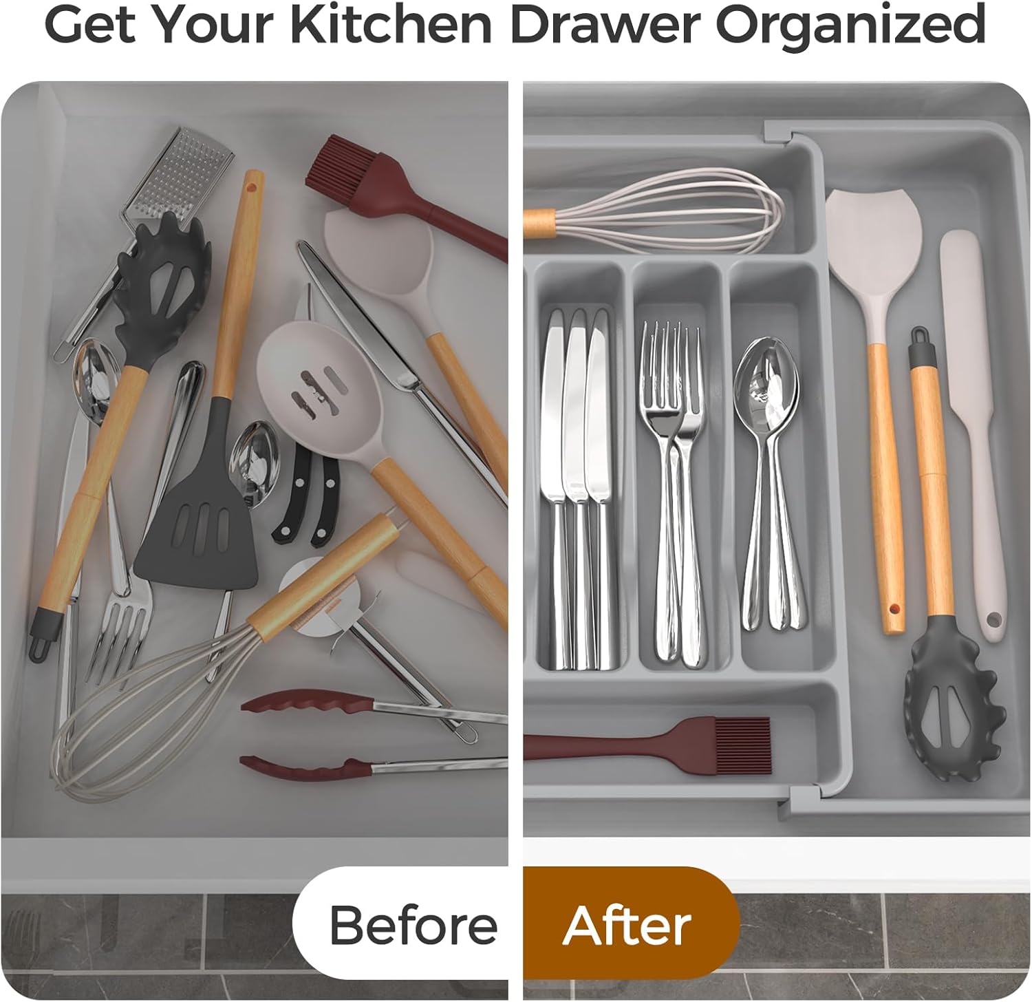 • 【Adjustable Size】:The width of the utensil drawer organizer expands from 12.4" to 21", perfectly fitting most standard drawers. (Measure your drawer before buying for the best fit).