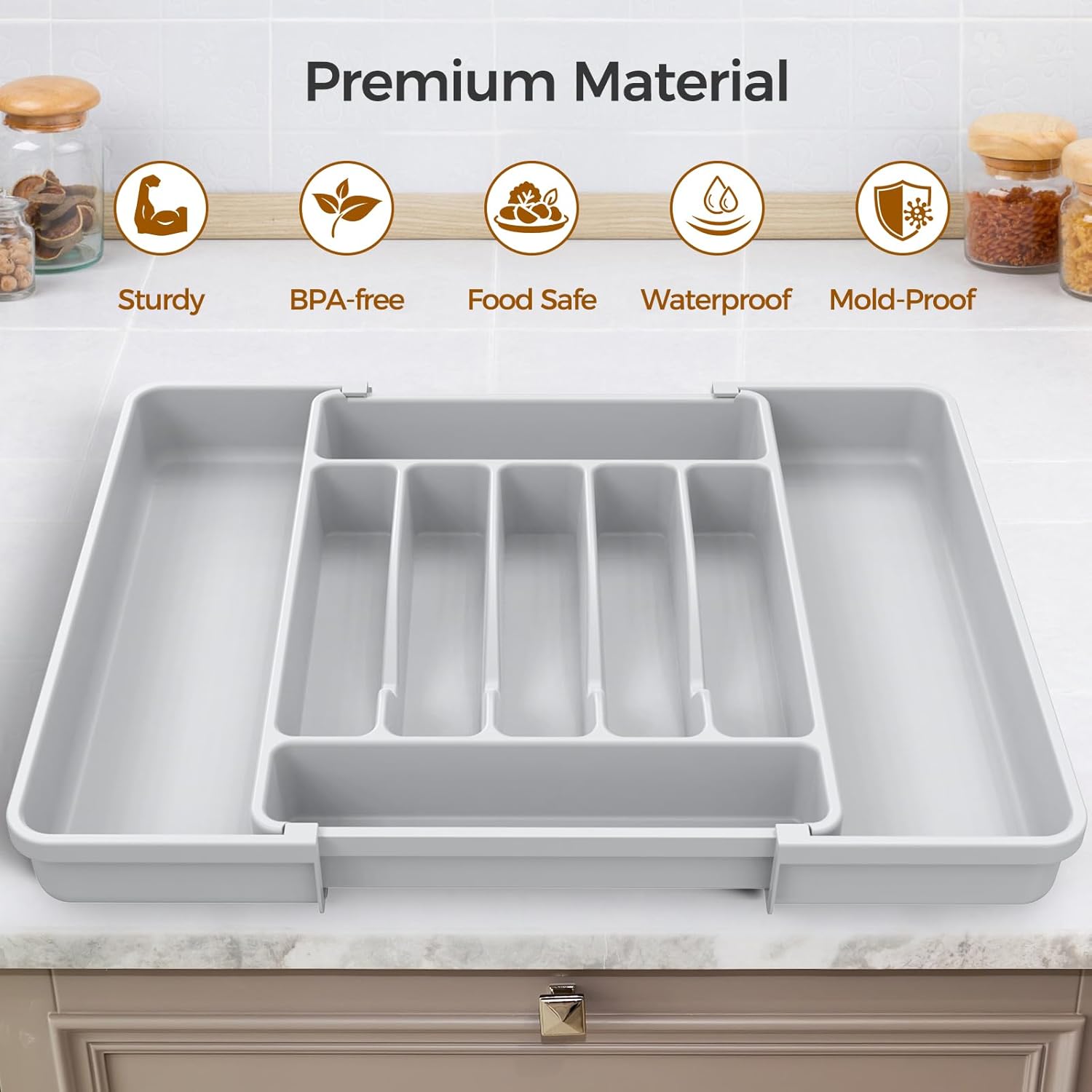 Extra Large Expandable Silverware Organizer, BPA-Free Food-Safe Cutlery Flatware Organizer, Kitchen Utensil Drawer Organizer, Adjustable Silverware Holder for Spoons Forks Knives, Gray