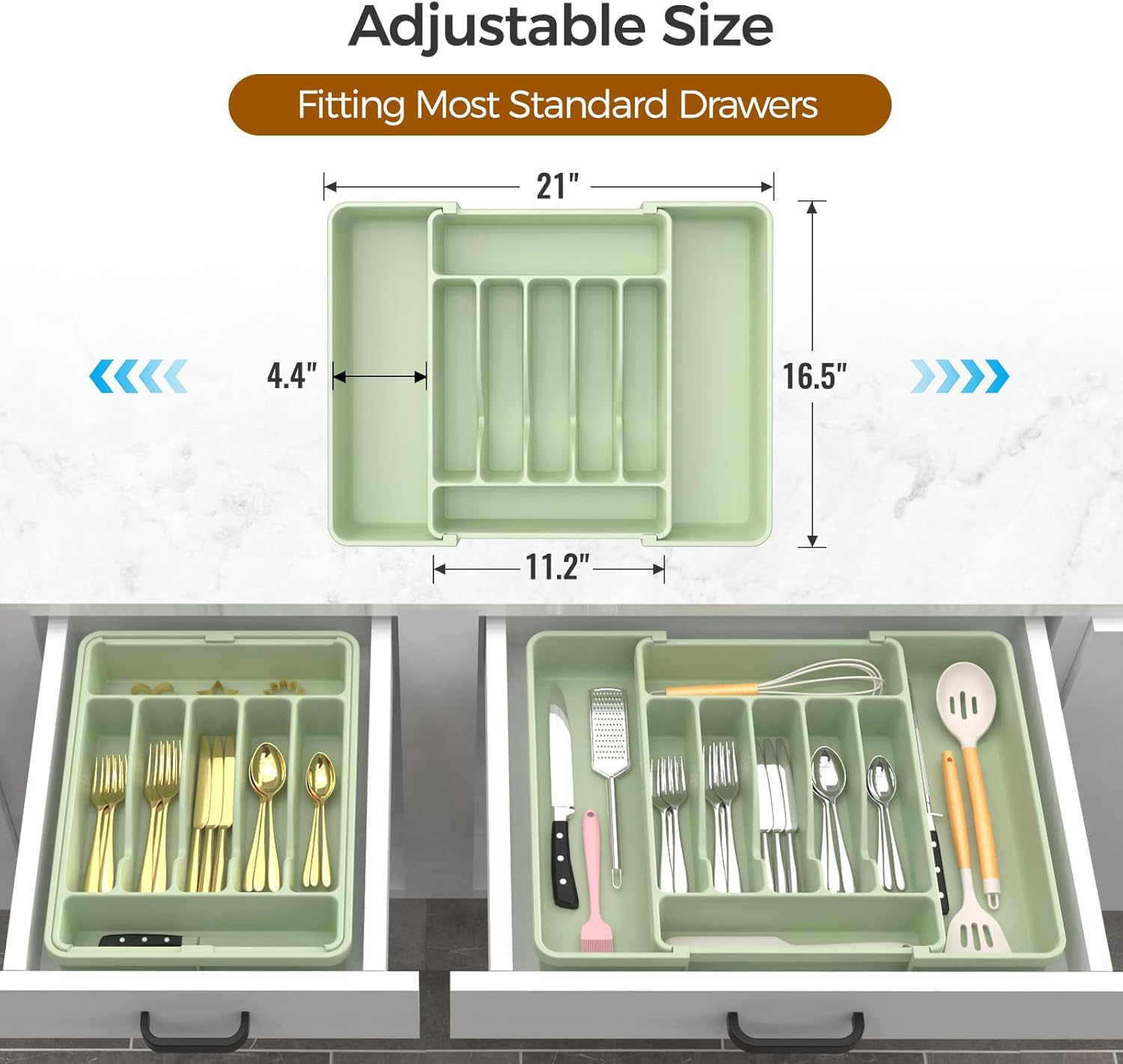 • 【Adjustable Size】:The width of the utensil drawer organizer expands from 12.4" to 21", perfectly fitting most standard drawers. (Measure your drawer before buying for the best fit).
