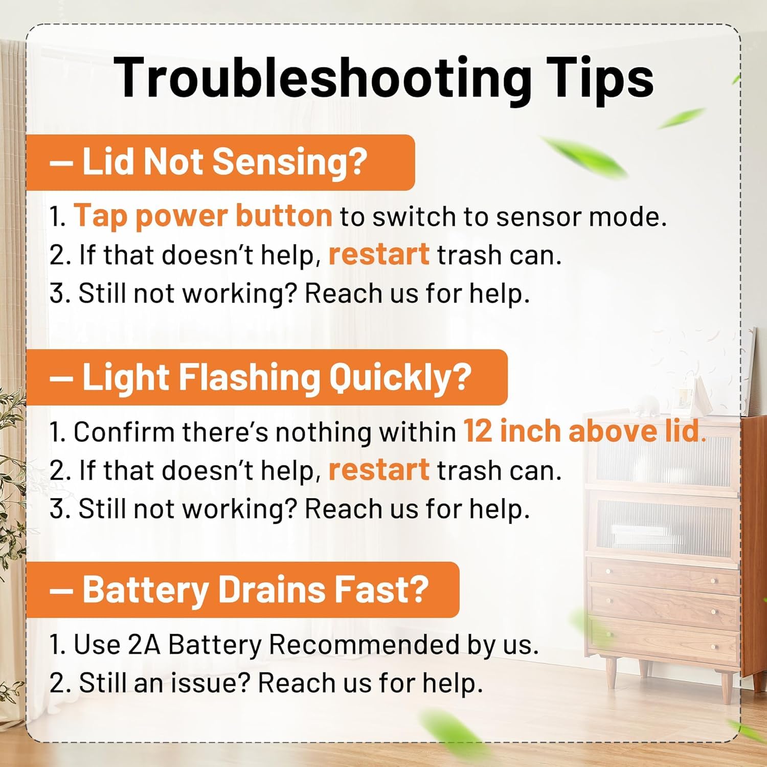- ใWATERPROOF & MOISTURE-PROOFใ Smart Motion Sensor Garbage Bin with lid is made of high-quality PP material, making it durable and waterproof. With an IPX5 waterproof rating, it is suitable for bathroom splashes. The Garbage Can prevents water from entering, making it easier to clean.