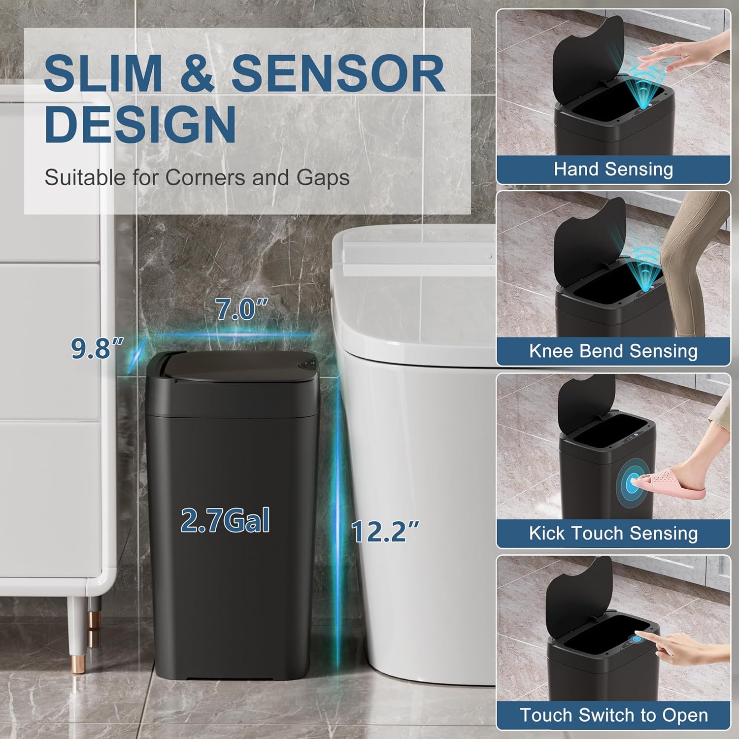 2 Pack 2.7 Gal Bathroom Trash Can with Lid, Automatic Trash Can Small Smart Garbage Can Touchless, Slim Motion Sensor Waterproof Plastic Trash Bins for Bedroom Office Kitchen Toilet Black