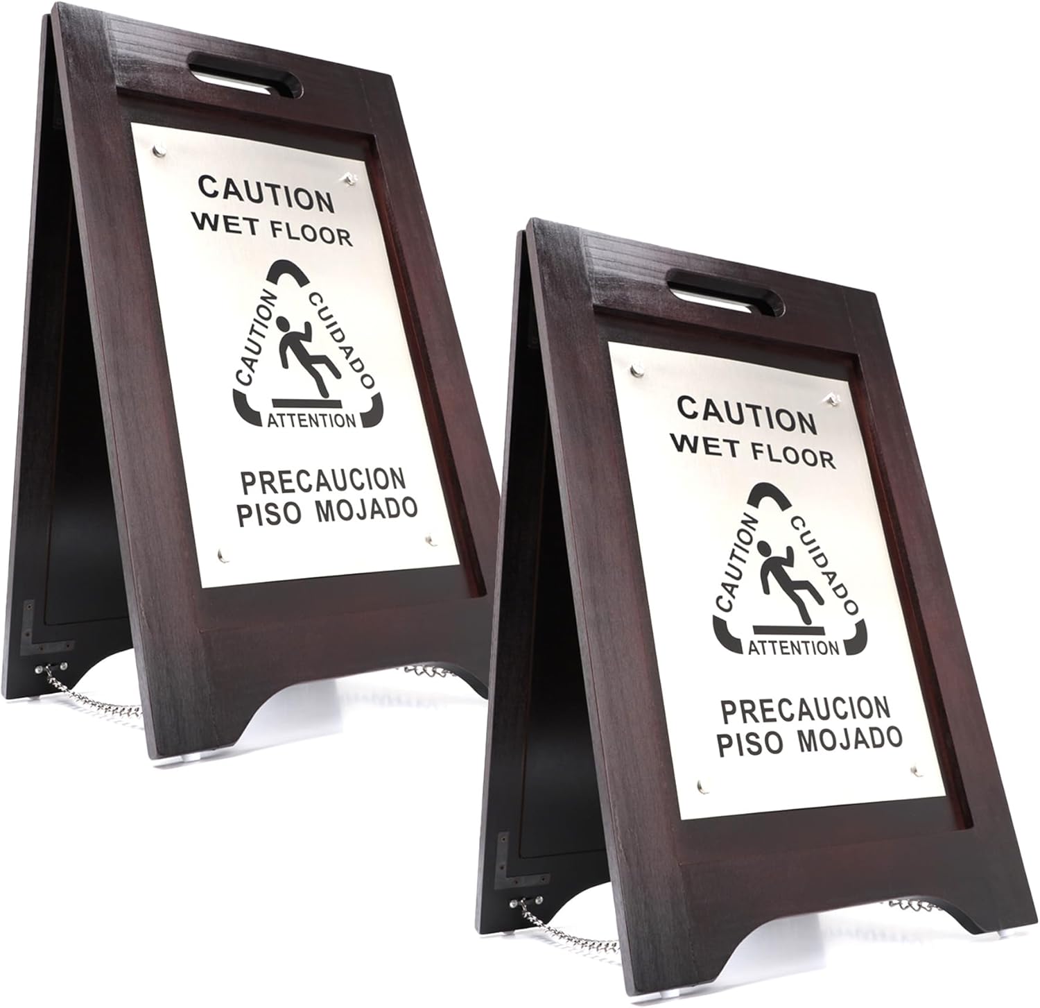 Premium Wooden Caution Wet Floor Sign – Bilingual w/Non-Skid Plastic Feet – For Hotels, Schools, Offices, Areas, Restrooms, Pool Decks - Brushed Nickel Plate - (2 Pack)
