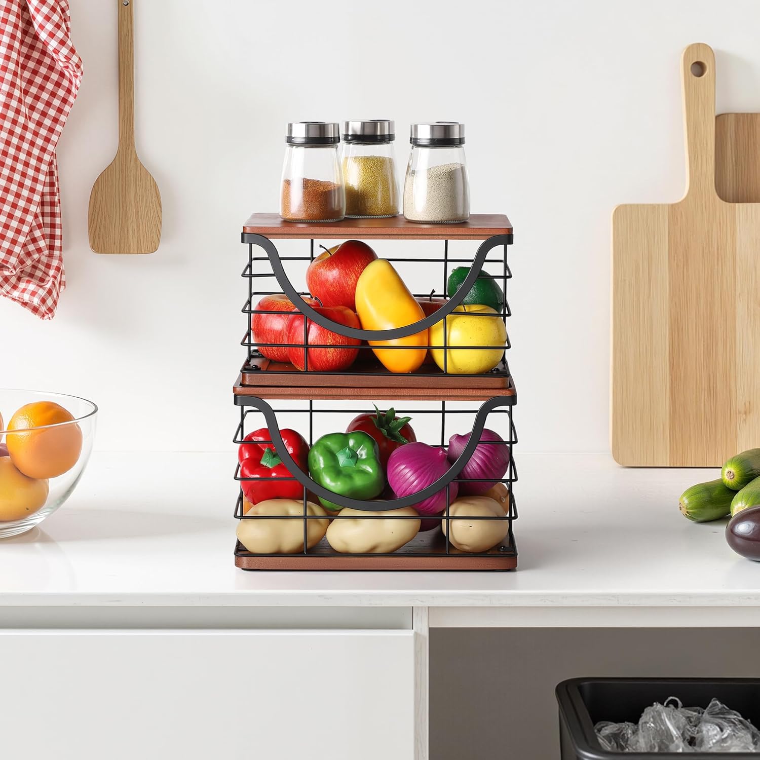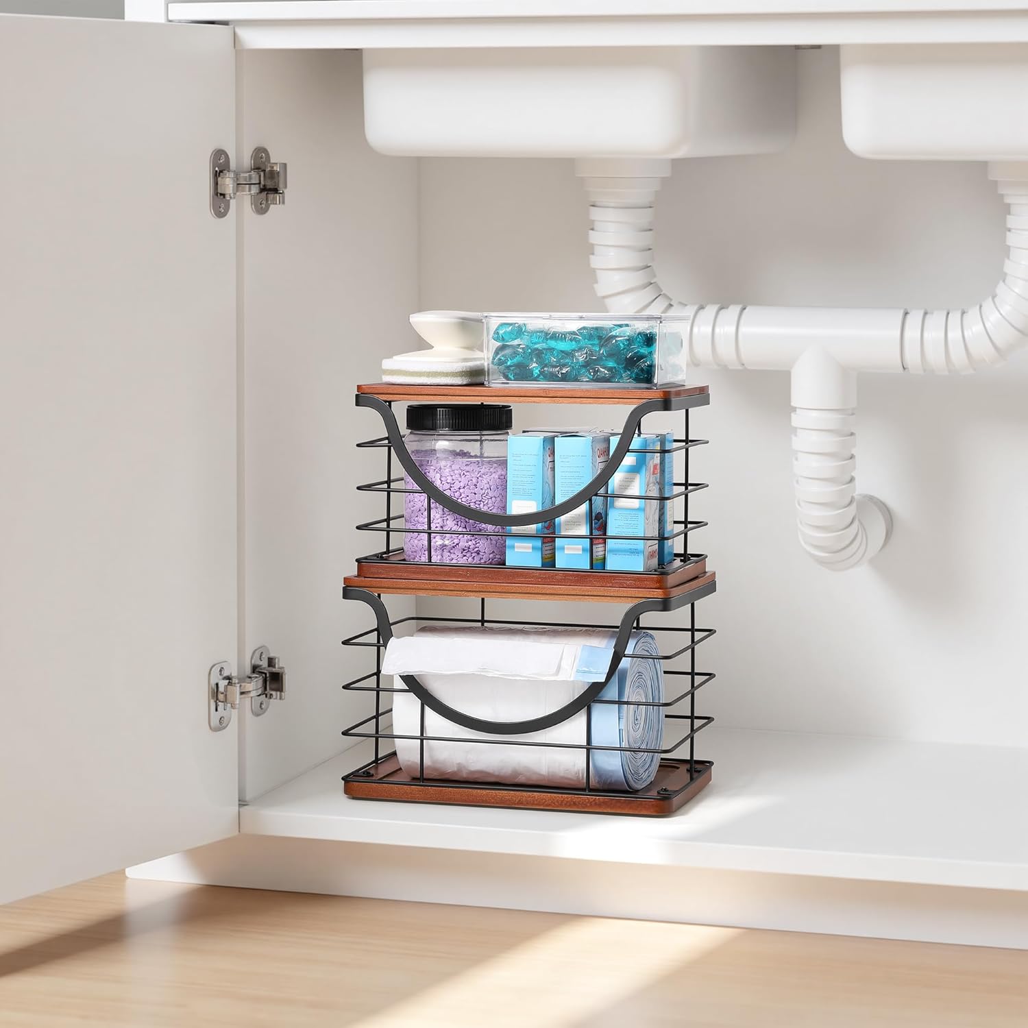 • 2 Ways to Use -stackable wire basket with bamboo top can be used on a tabletop or self-adhesive wall mounted. No need to drill holes, won't damage the wall. Multi-functional Garbage Bag Storage Dispenser is suitable for kitchen, laundry room, toilet, under the sink, cabinet, etc., you can store laundry supplies, cleaning supplies, vegetables and fruits, snacks and so on