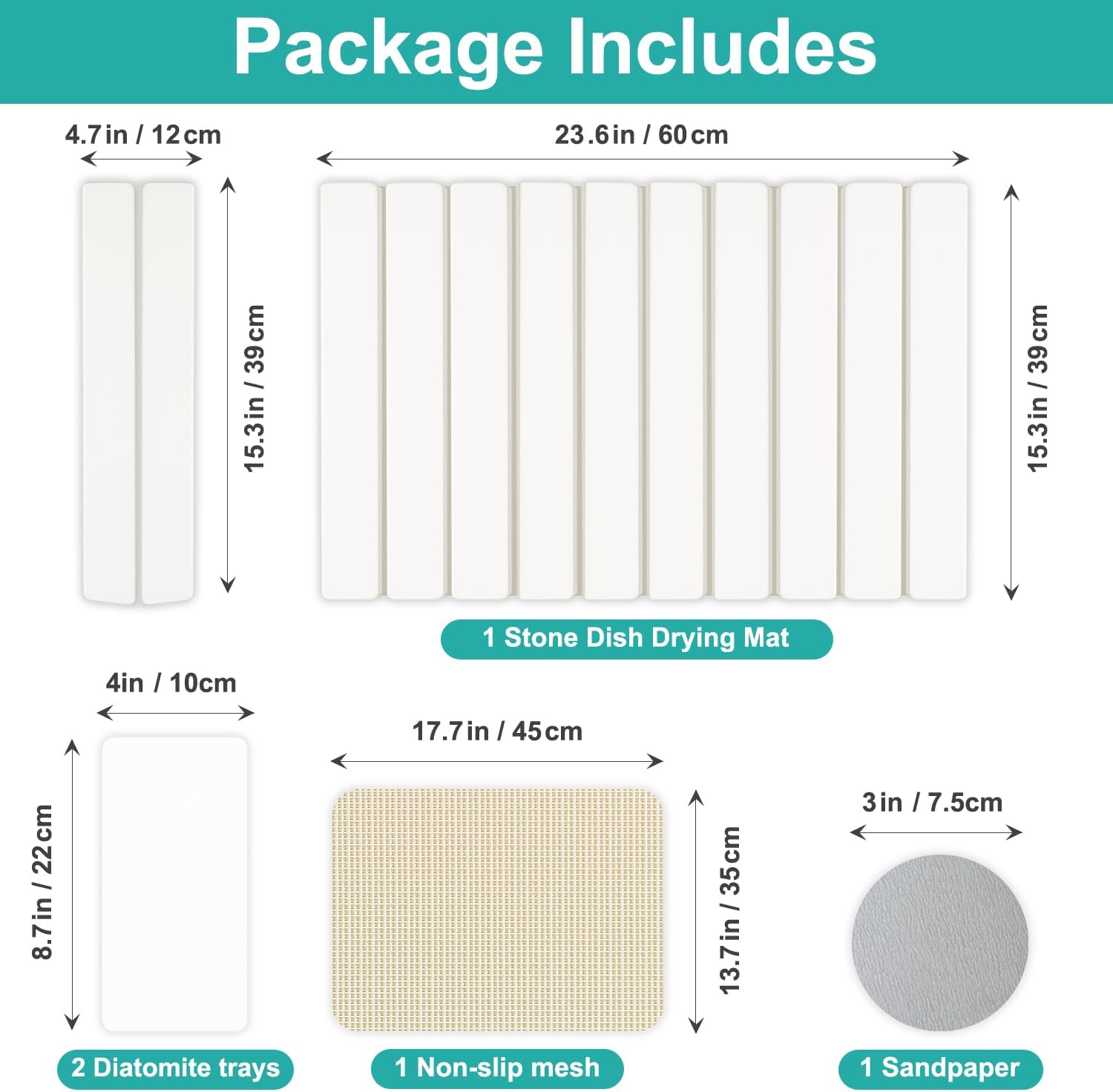 • 3 Pack Drying Stone Mats Set: You’ll receive one 23.6" x 15.3" large stone dish mat & 2 small stone drying trays, 1 sandpaper, and 1 non-slip pad.
