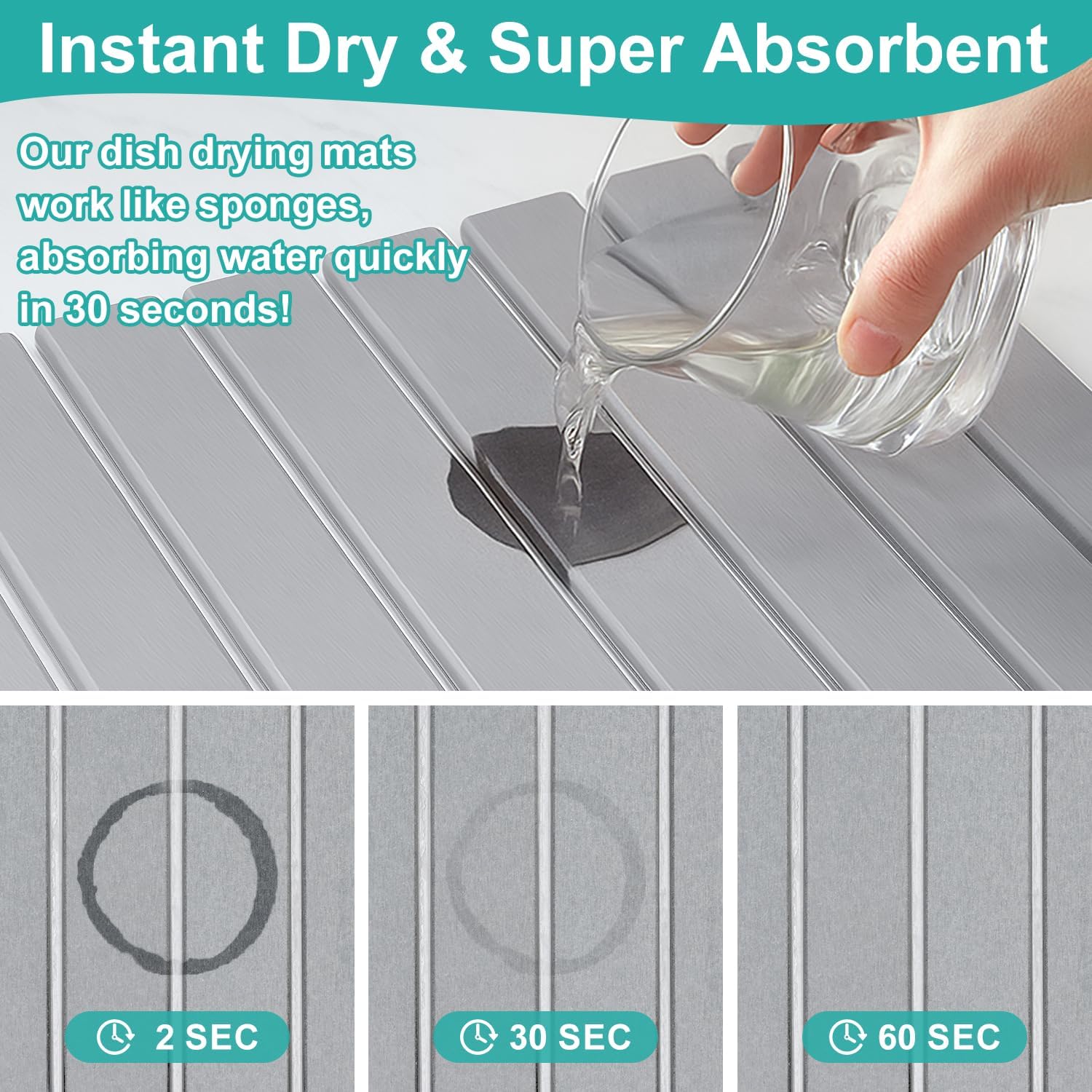 • Food-Grade & Fast Dry Material: Made from high-quality and non-toxic diatomaceous earth, this diatomite dish drying mat's highly absorbent material quickly soaks up water, and makes drying dishes and cups very easy — while keeping your countertop dry with no wet mess.