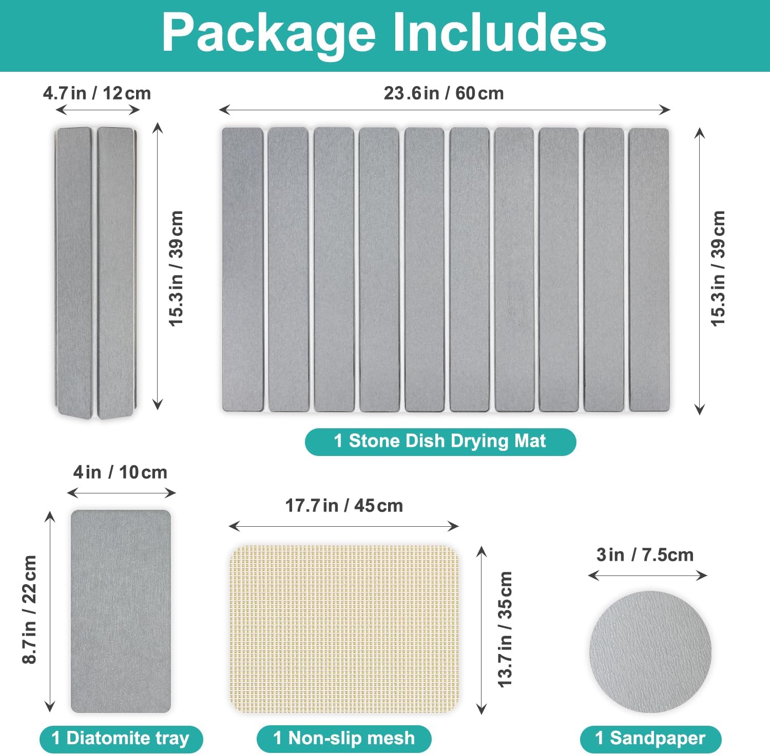 • 3 Pack Drying Stone Mats Set: You’ll receive one 23.6" x 15.3" large stone dish mat & 2 small stone drying trays, 1 sandpaper, and 1 non-slip pad.