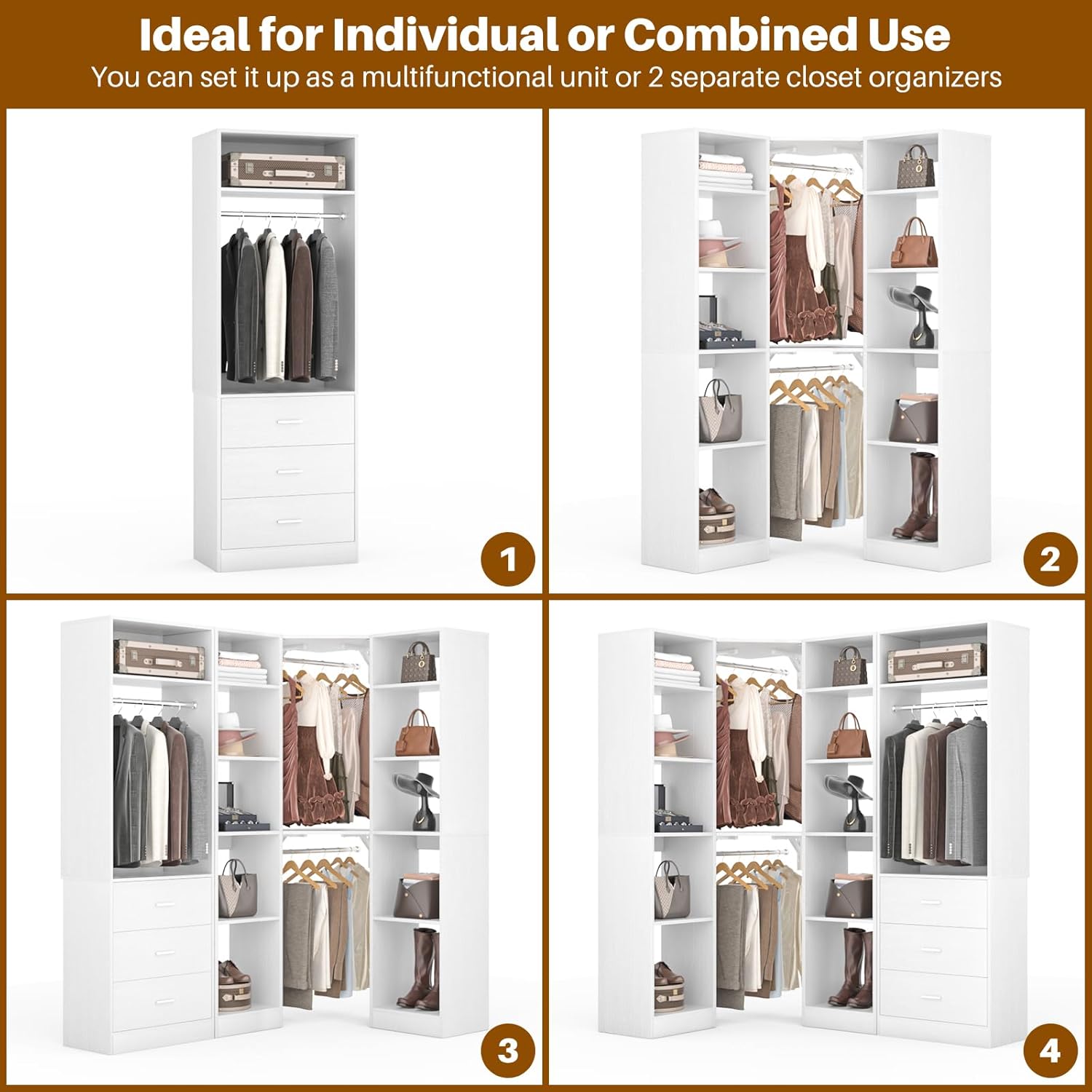 - DIY Customize Your Dream Walk-in Closet: Our closet systems put the design in your hands, allowing you to DIY to your liking. You have the flexibility to mix and match different modules based on room size, personal style and storage requirements to create an dreamful L- or U-shaped walk-in closet.