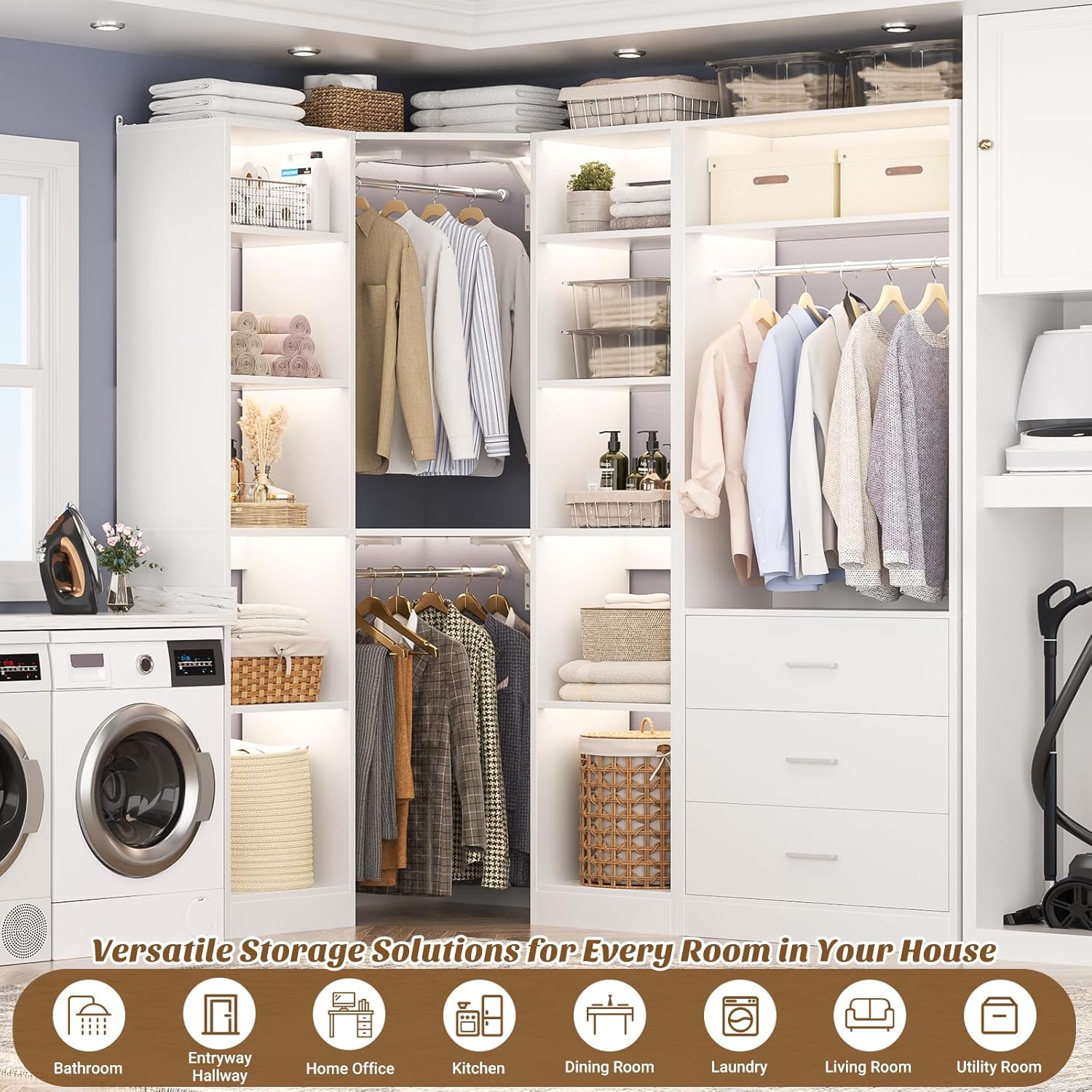 - Versatile Closet System with 2 Sets: This 63.2" large corner closet system is versatile and can be set up as a multi-functional unit or as 2 separate closet systems that can be used for checkrooms, pantries, laundry rooms or food storage, making it suitable for storage in any room throughout your house.