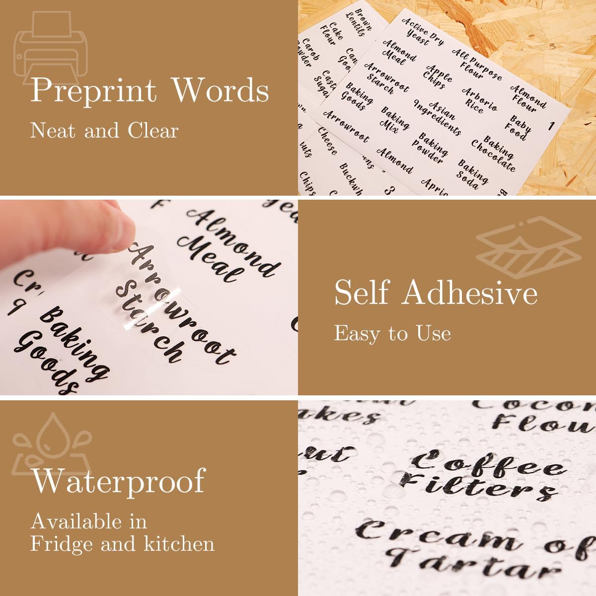 - 【PERFECT FOOD LABELS INCLUDED】248 Kitchen pantry labels for pantry storage containers to keep your food fresh and pantry tidy. Minimalist labels are black text on transparent food labels stickers suitable for all glass jar with lids airtight. Pantry decal organization labels are preprinted on premium waterproof vinyl stickers that won't tear or peel off but can easily be removed.