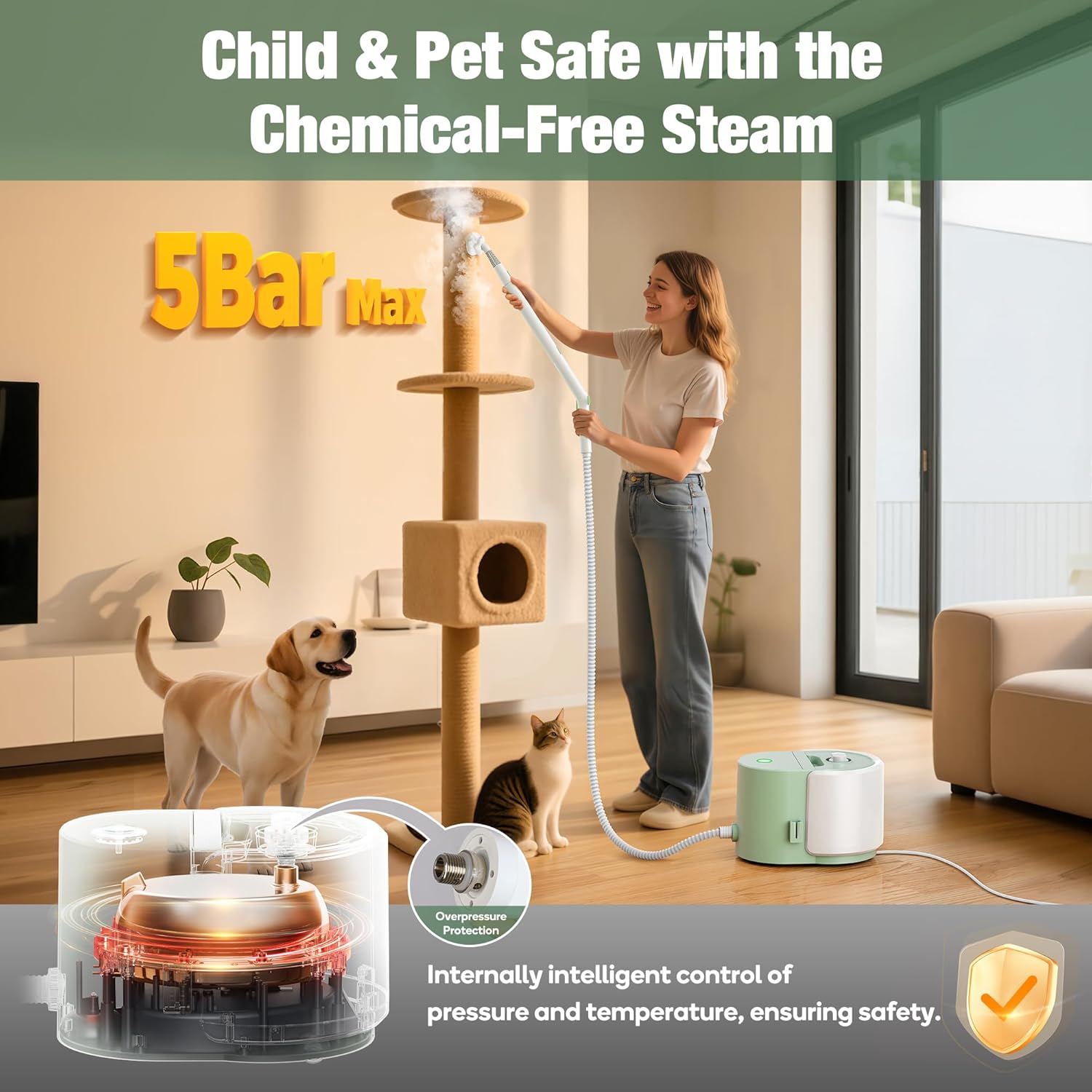 - [Multi-Layer Safety Mechanism] Engineered with pressure and temperature controls, this system ensures stable, consistent operation. With an advanced safety valve, overpressure protection enhances safety by preventing pressure buildup—while steam-only cleaning keeps it friendly to kids and pets and kills bacteria without harsh chemicals. NOTE: Designed for 110~125-volt outlets only.