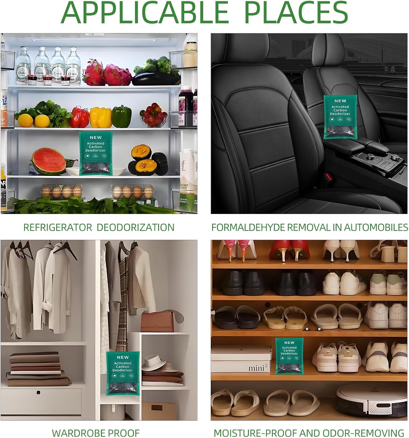 • New type activated charcoal odor absorber:The activated charcoal bag employs new technology, offering a significantly enhanced adsorption capacity of nearly 1 times compared to traditional bamboo charcoal. It is a versatile solution suitable for various applications, including household, pet, automotive and general deodorising needs