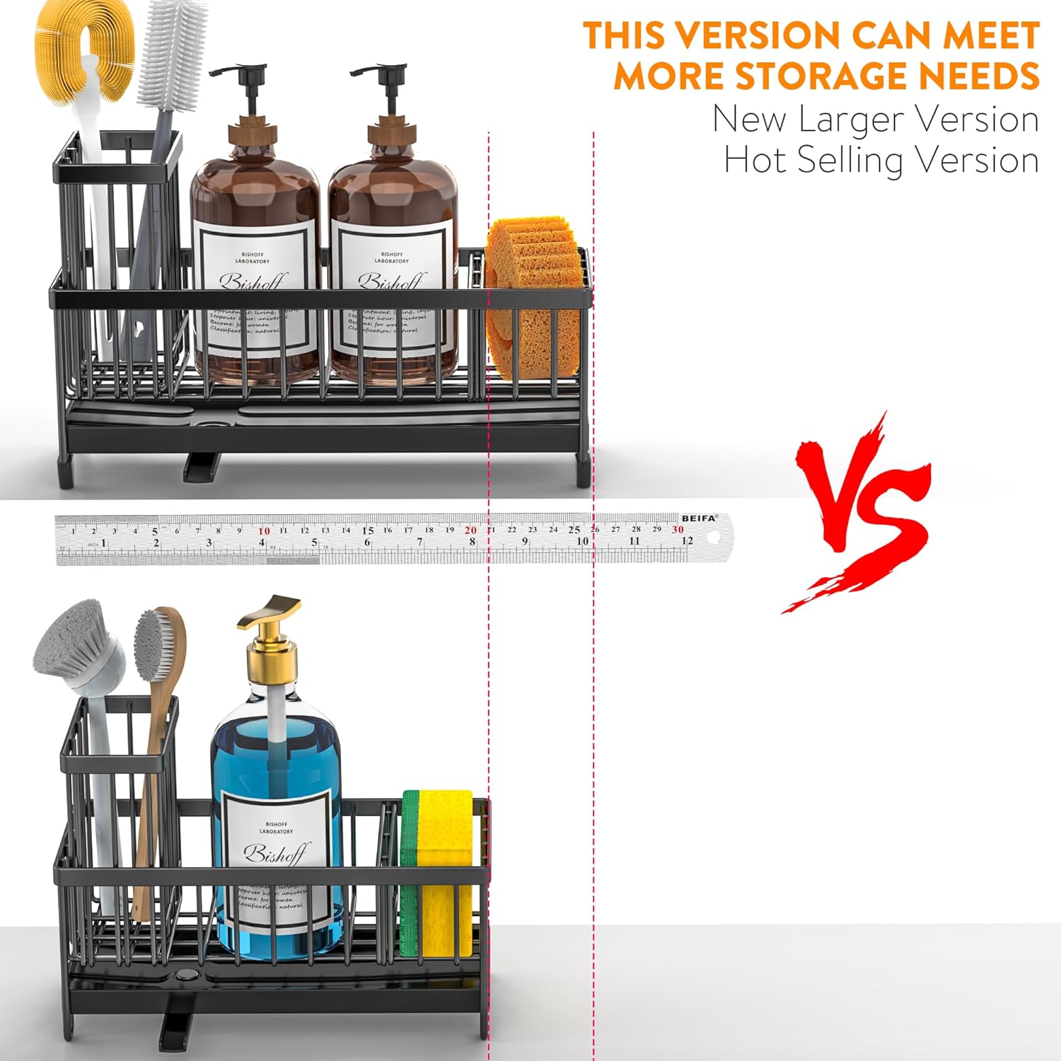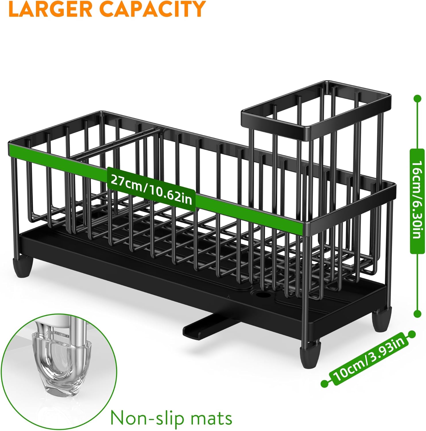 • 【LARGER CAPACITY】Cisily kitchen sink organizer is longer in length: 10.62 inch. So this sink caddy provides larger storage space and hold more cleaning accessories: dish soap dispenser x1, hand soap dispenser x1, sponge x1, some brushes.