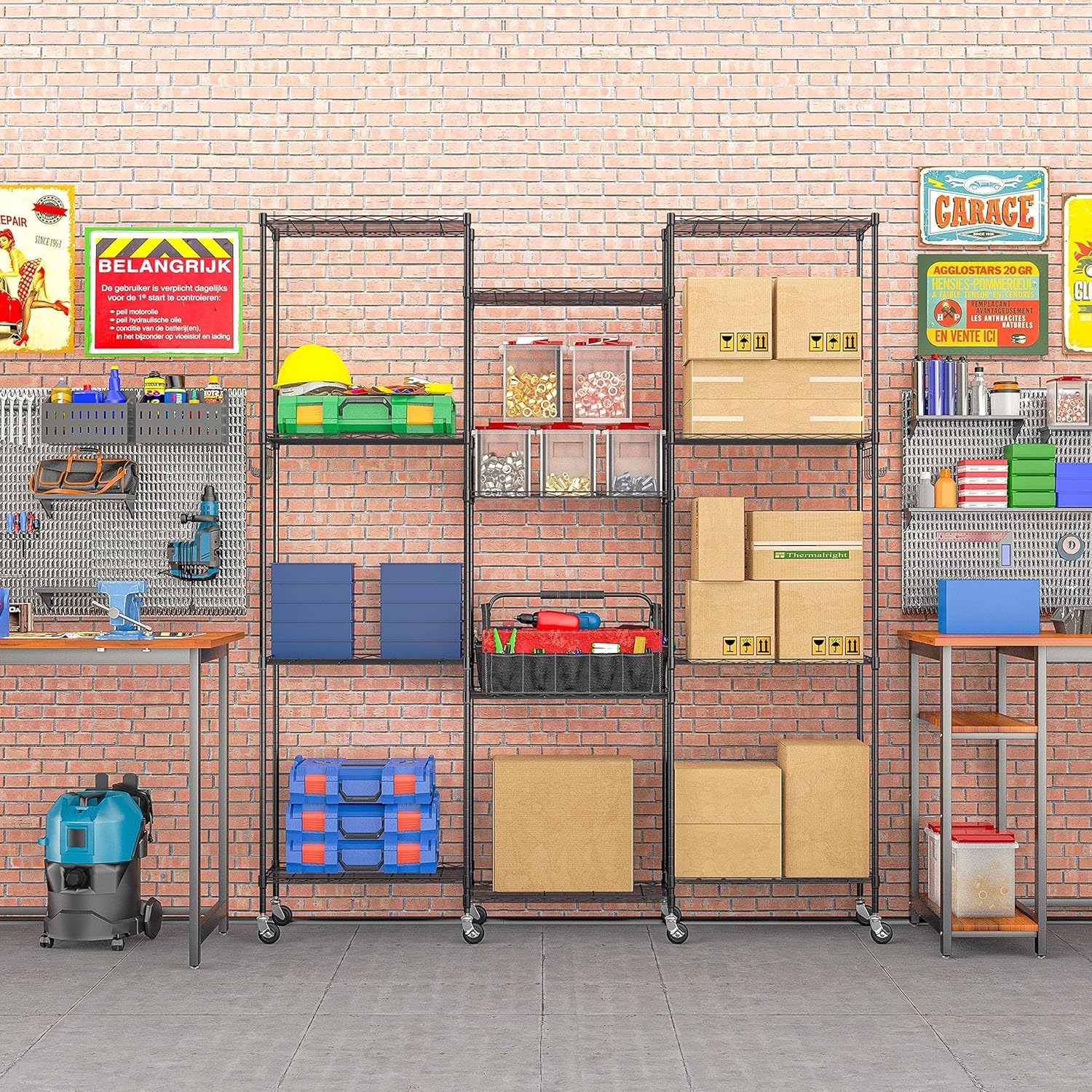 Himimi 6-Tier Storage Shelf Units, Adjustable Wire Shelving with Wheels, Metal Shelves with Stainless Side Hooks, Free Standing Shelving for Laundry Bathroom Kitchen Pantry Closet, Black