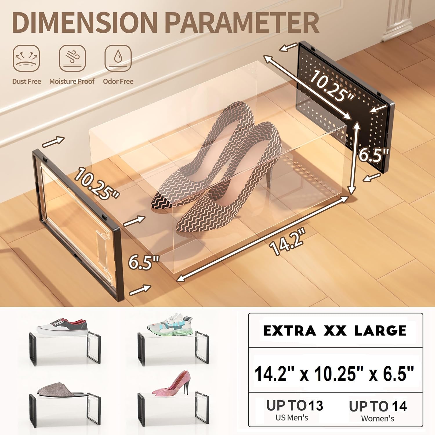 • XXX Large Size Shoe Box: Upgraded wider and higher shoe organizer fit for larger shoes size . Unit size is 14.2"(L) x 10.25"(W) x 6.5"(H), fits for women’s shoes up to US size 14 and men’s shoes up to US size 13. Suitable for many types of shoes such as heels, flats, sneakers, leather shoes, sandals, wedges, and others shoes.