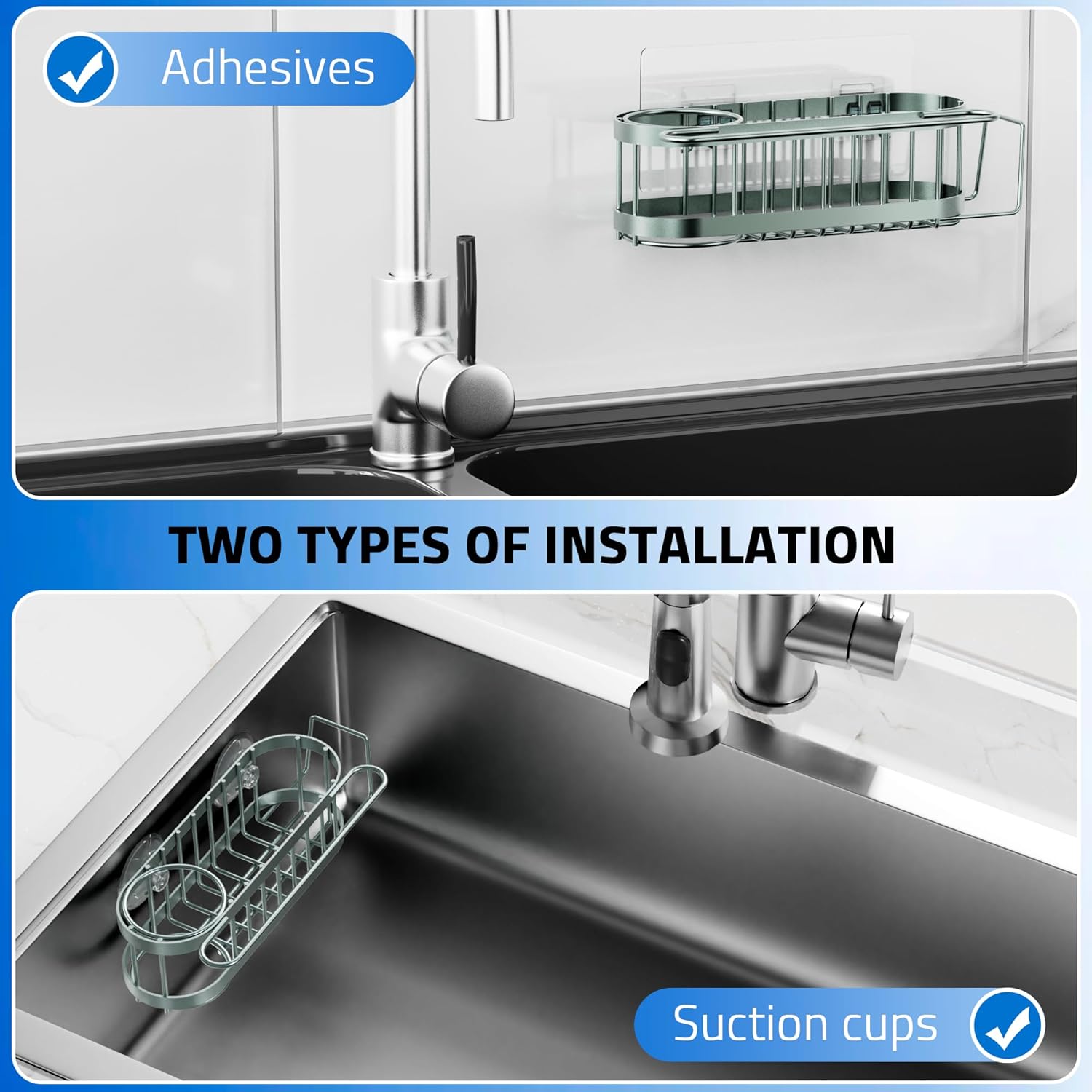 • 【SUCTION CUPS AND ADHESIVE MOUNTING】Cisily sponge holder offers two mounting methods (suction cups or adhesive). It can better meet your various needs for installation location, and can be installed wherever you want. This is a great kitchen accessories!