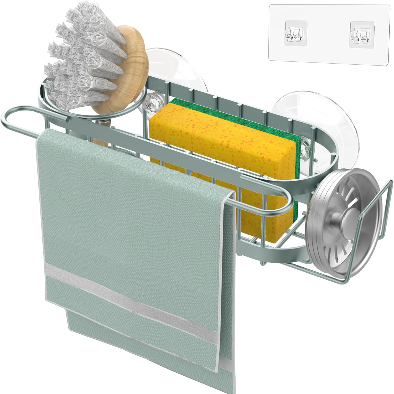 Cisily Sage Green Kitchen Sink Caddy Sponge Holder in the Sink, Stainless Steel Kitchen Organizer, Brush Holder, Dish Cloth Hanger 2 Installation Ways (Suction & Adhesives