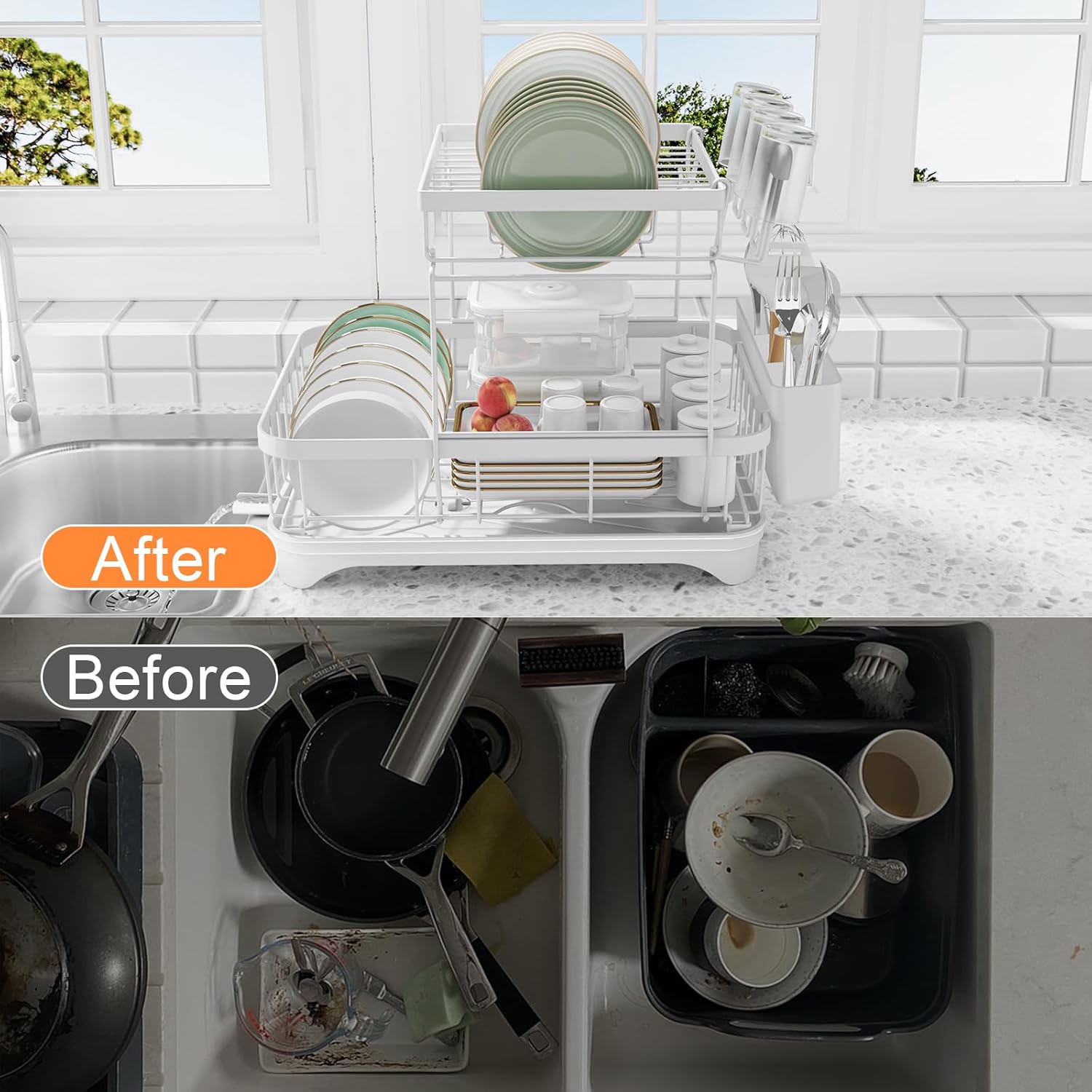 Dish Drying Rack - Auto Draining Dish Rack for Kitchen Counter, Large Capacity Dish Drainers Organizer with Drainboard, 2-Tier Drying Rack with Utensil Holder White