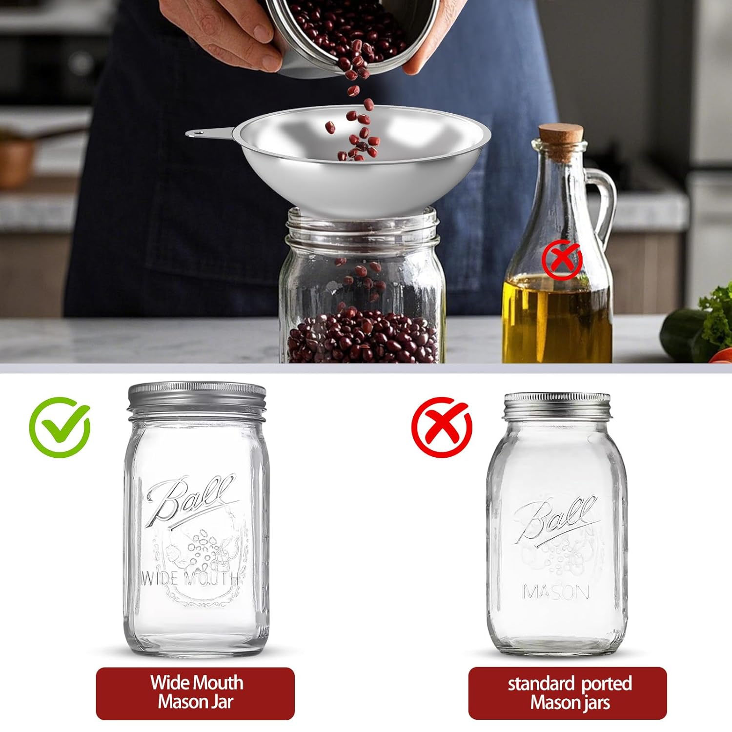 • Versatile for Multiple Uses : Perfect for transferring liquids, dry ingredients, powders, jams, and more. Ideal for canning, brewing, baking, and food prep. The included strainer helps remove unwanted particles for a cleaner, smoother result.Perfectly Engineered for Wide-Mouth Mason Jars