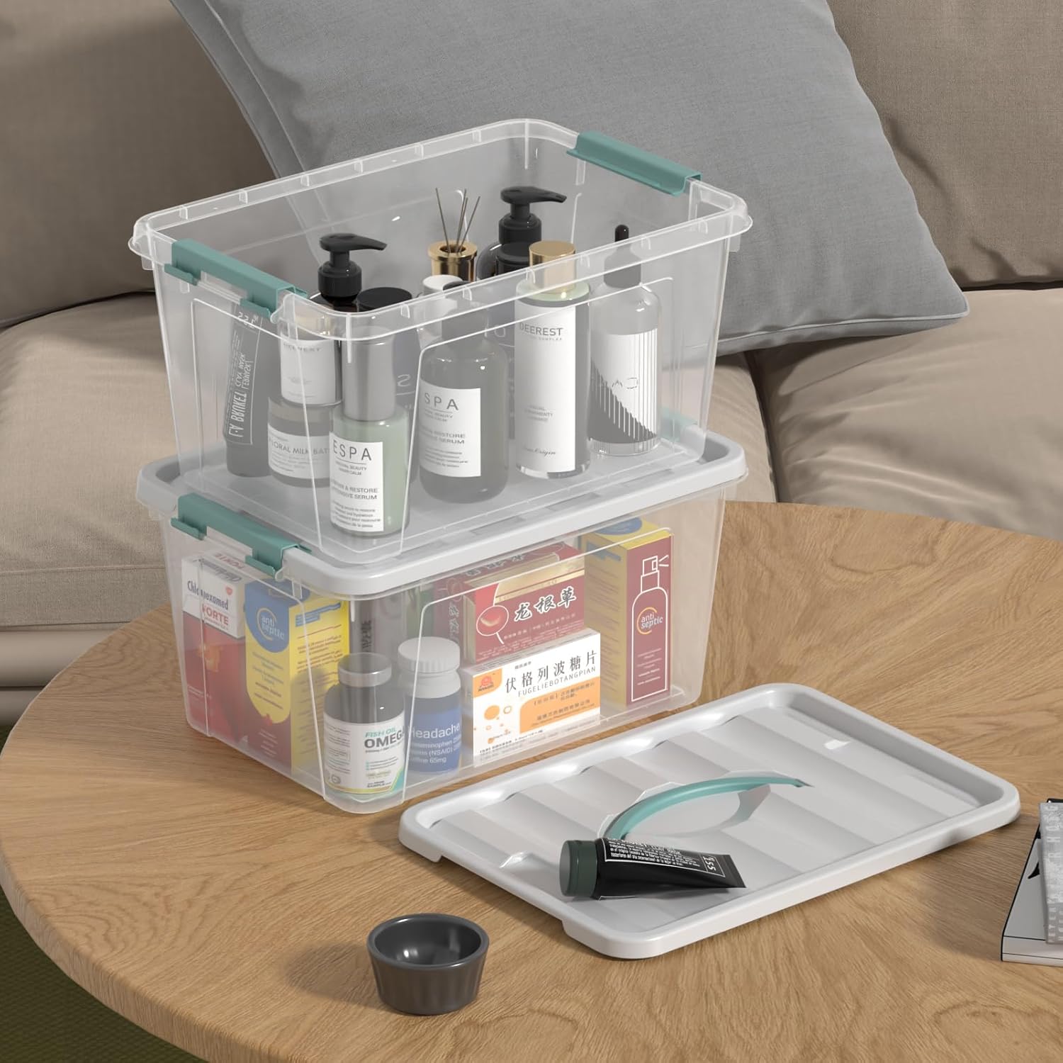 • Equipped with sturdy storage buckles that latch onto the lid, these plastic clear latches box offer superior containment. Your contents are safeguarded from dust, liquid, and other unwanted elements once the lids are securely fastened. Additionally, the lid's green handle allows for easy and convenient lifting of the storage lidded box