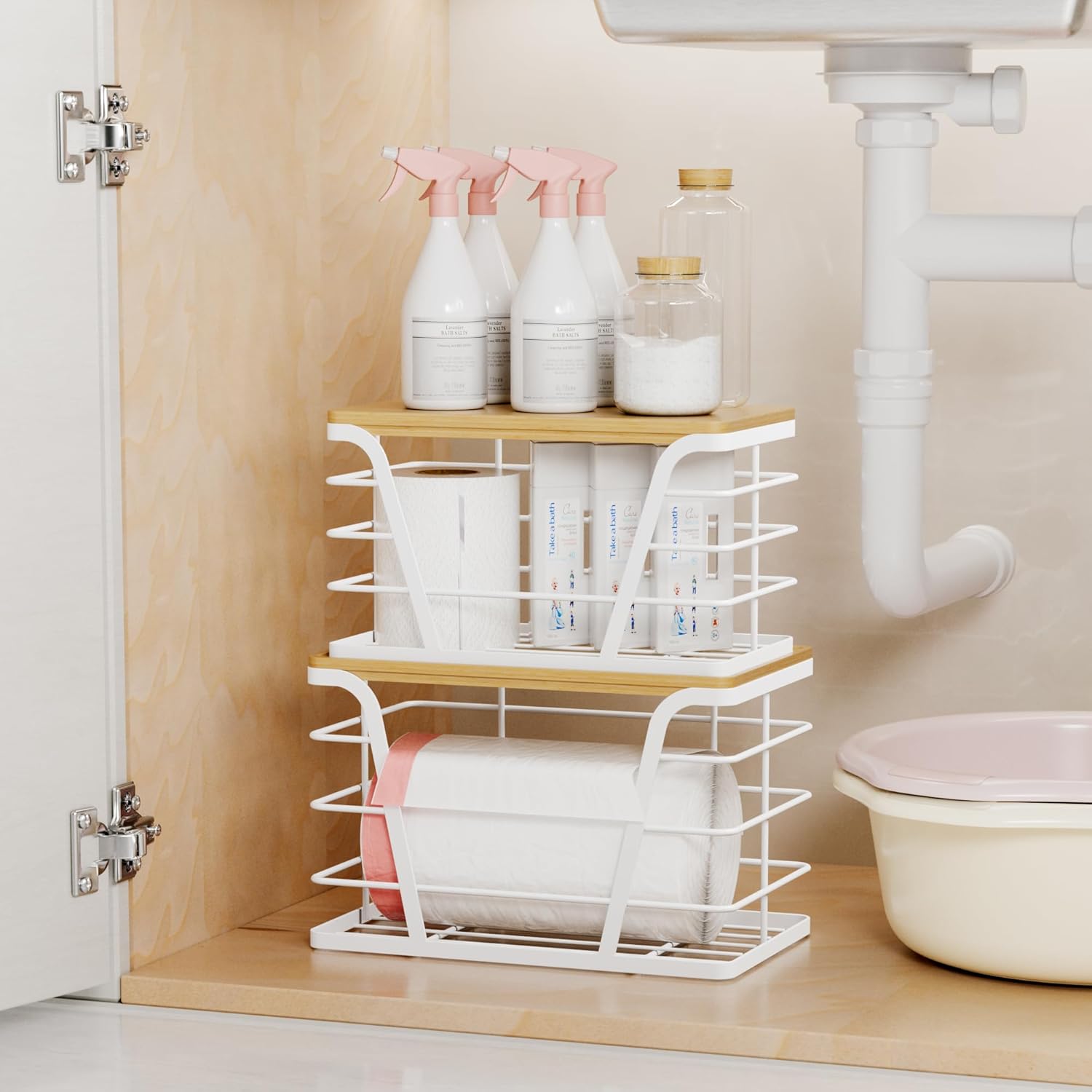 • Thoughtful Design:The large garbage bag holder’s removable bamboo cover to hold smaller units in place, creating a sturdy ​under sink organizer tower. Perfect for laundry storage rooms or pantry organizers and storage