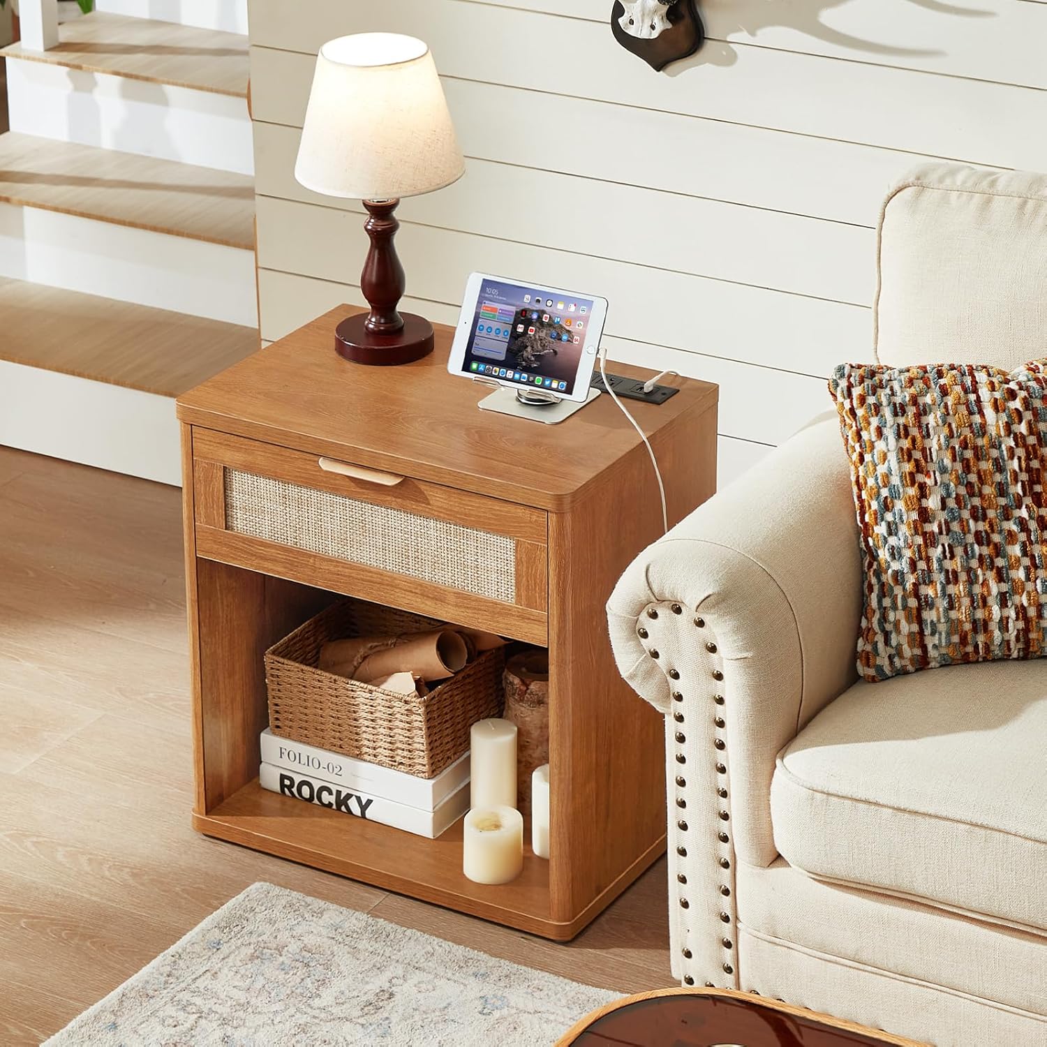 - Rattan Side Table:The nightstand cleverly blends boho and modern styles.It has unique rattan drawer and naturally textured surface highlights its artistic charm.Both beautiful and practical,the end tables bedroom comes in different color options and easily integrates into various of decorative styles, creating a warm home atmosphere.