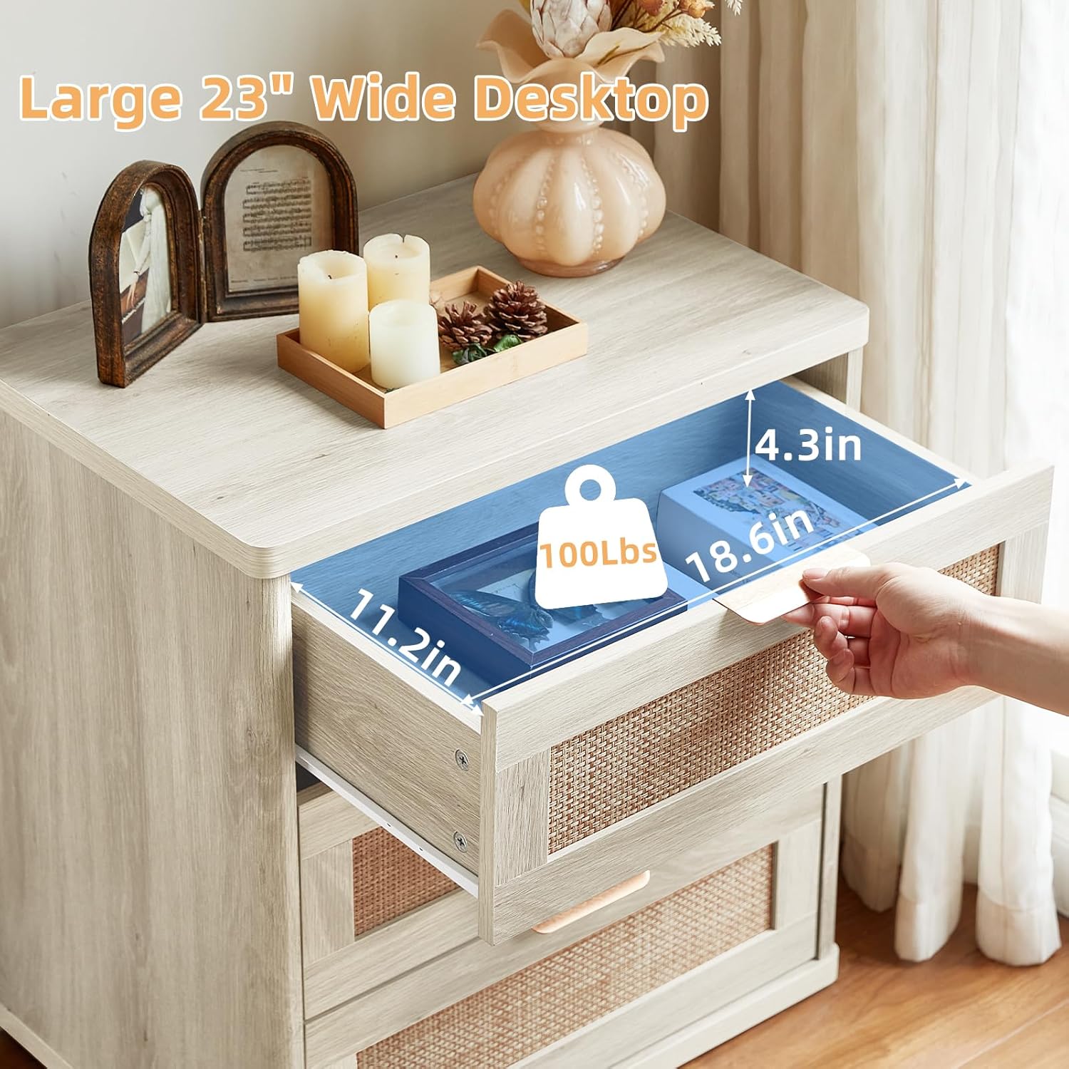 LEYAOYAO Rattan Night Stand with Drawers, 23" Large 3 Drawer Boho Nightstand, Grey White Bedside Table Storage Cabinet, Bed Side End Tables Dresser for Bedroom, Living Room, Hallway, Closet
