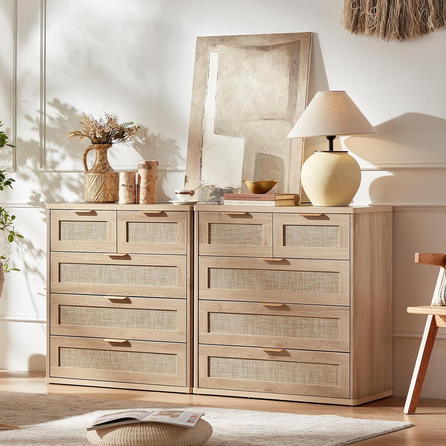 - Boho 5 Drawers Rattan Dresser for Bedroom : This 5 Drawer Wood Dresser flawless combines Boho and modern styles. The rattan-decorated drawers and natural wood grain enhance its visual appeal. This exquisite dresser for closet is available in multiple color options, easily blending into various decor styles to create a cozy home atmosphere.