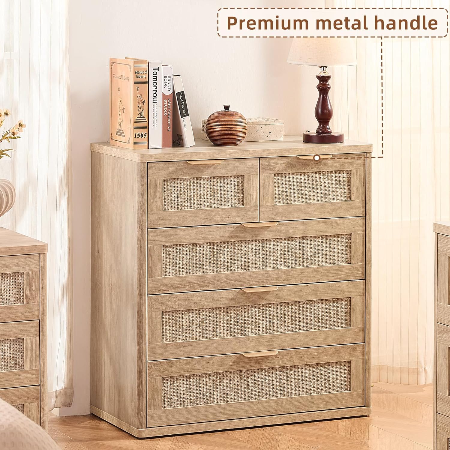 LEYAOYAO Rattan Dresser for Bedroom, 33.5" Tall Chest of Drawers, Modern 5 Drawers Boho Dressers with Storage, Light Oak Dresser Wooden Closet Organizer for Living Room, Hallway, Natural Wood