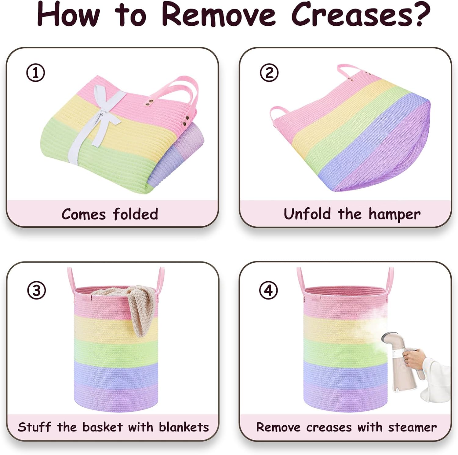 • ❤【WAY TO RESTORE ELEGANT SHAPE】 Our collapsible baskets are folded during shipping. Please fill the hamper with clothes or blankets for a period of time. If you want to remove creases from the surface of the tall basket, you can use a steamer.