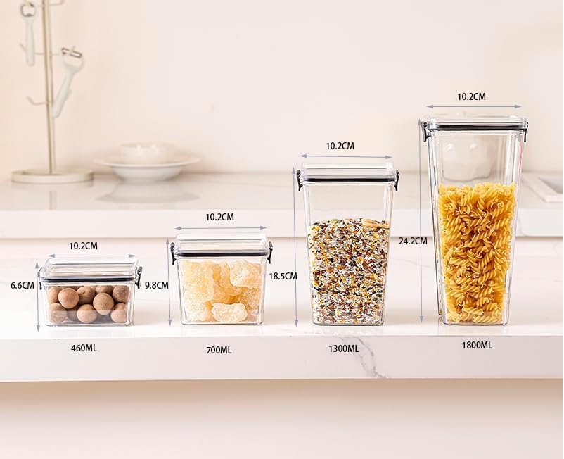• If used to store four different specifications of grains, it can be applied to different scenarios. This collection includes one 1800ML, one 1300ML, one 700ML, and one 460ML