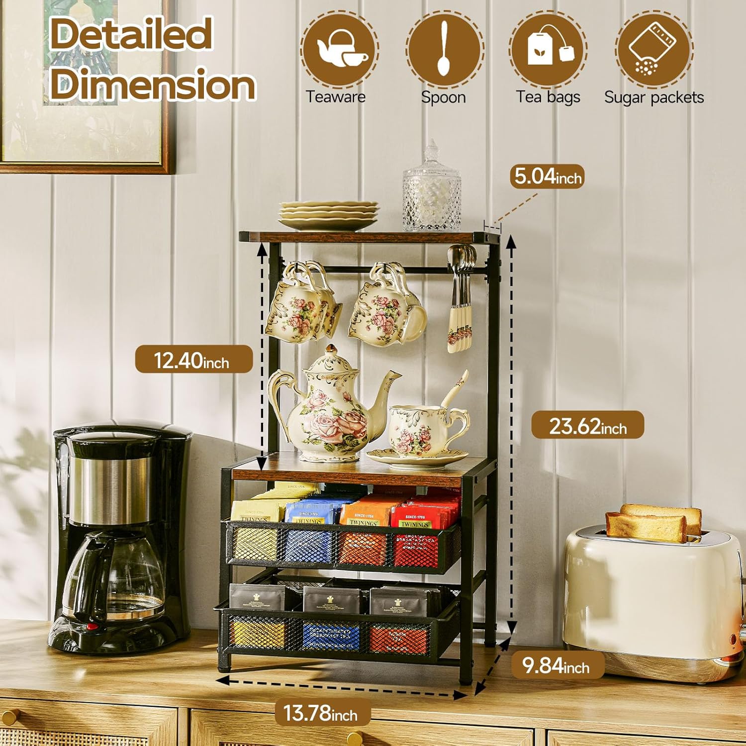 - Efficient Storage: Pinzoveco tea bag organizer features an integrated design for efficient, compact storage. Assembled dimensions 13.8*9.8*23.6" It keeps everything you need for tea in one place, saving you time and allowing you to enjoy your tea more. It can hold tea cups, teapots, spoons, bags, sugar packets, honey sticks, and more. Say goodbye to clutter with this all-in-one storage solution!