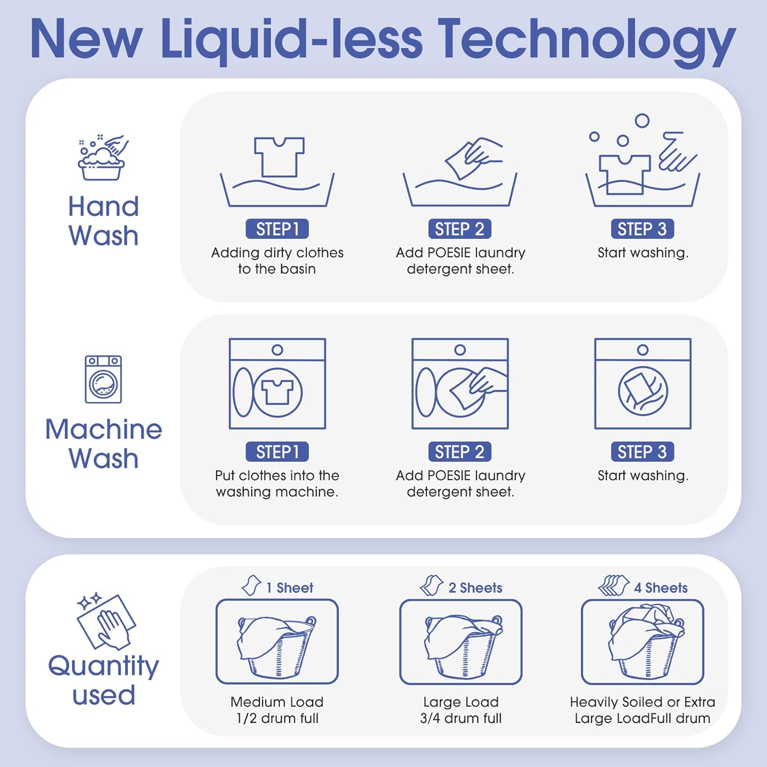 • Easy to Use - Liquidless detergent sheets, 1 sheet for small or medium loads where clothes are not very dirty, 2 sheets for large loads and 4 sheets for extra large loads, no waste. Not too little and not too much to save resources