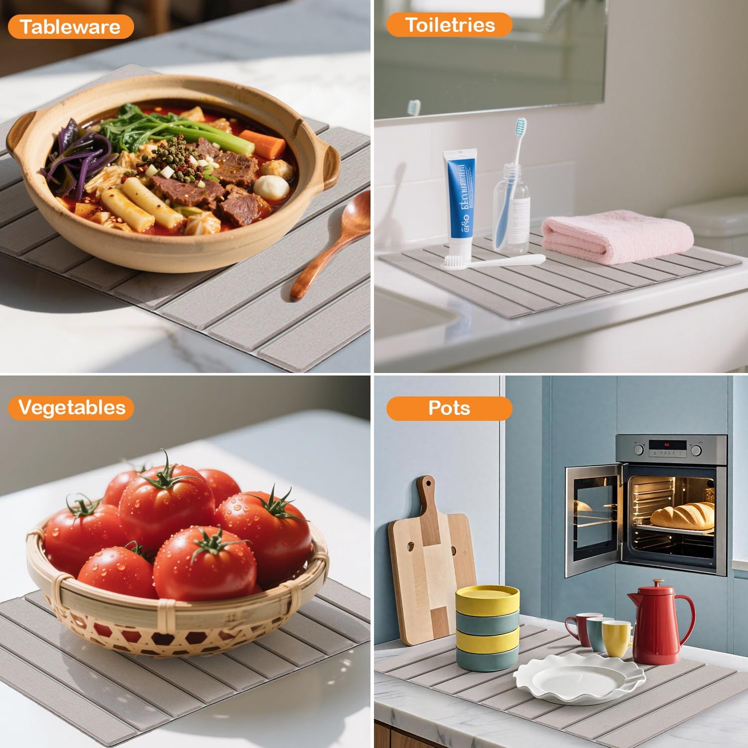 • Crafted with a textured stone-inspired surface, this mat quickly wicks away moisture from wet items, speeding up drying time. No more lingering puddles or soggy countertops—just a sleek, dry space ready for meal prep or entertaining.
