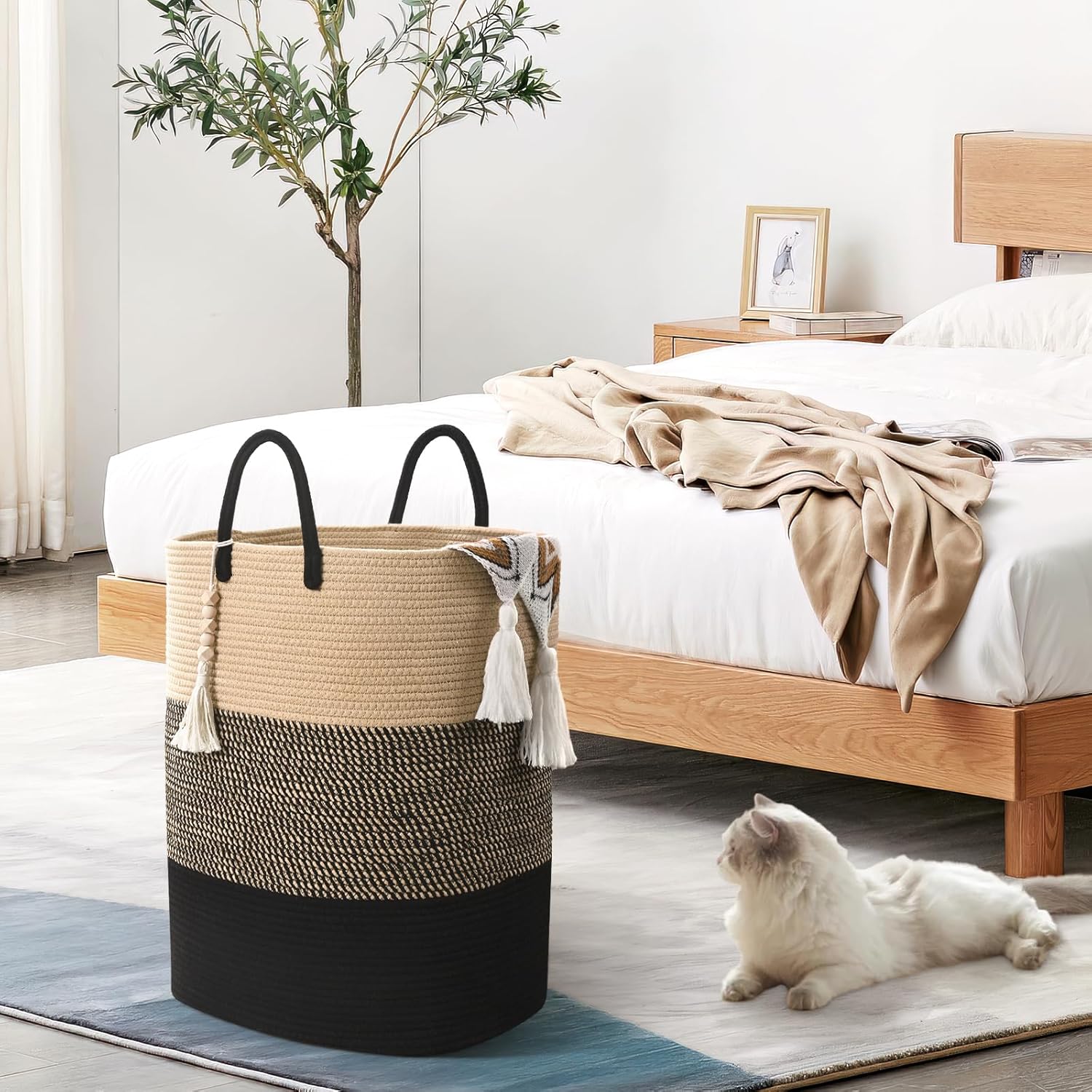 • ๐ŸŒˆ[DURABLE, BREATHABLE & SKIN - FRIENDLY COTTON]: Made of sturdy and odor-free rope cotton, woven laundry basket has a solid addition to any space. Tall laundry basket quite sturdy and spacious, capable of holding a good amount without losing its shape, which adds to its practicality.